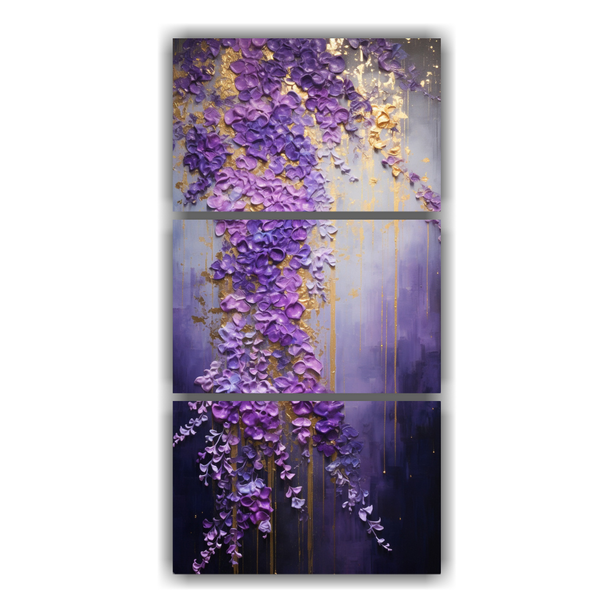 El cuadro decorativo estilo tríptico en tonos morados y dorados es una obra exclusiva de nuestra tienda Con su diseño elegante y sofisticado, este cuadro se convertirá en el centro de atención de cualquier espacio Los tonos plateado, azul marino grisáceo, gris, lila y dorado se combinan armoniosamente para crear una atmósfera cálida y acogedora Aprovecha nuestra oferta y adquiere este cuadro de alta calidad a precios accesibles