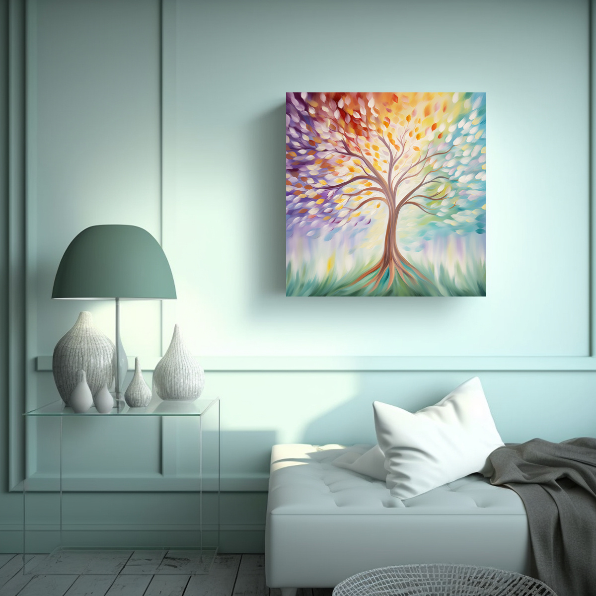 Este cuadro será el complemento perfecto para tu sala de estar Colócalo sobre el sofá en una pared blanca o gris claro para resaltar su elegancia Combínalo con cojines en tonos plateados, azules y grises para lograr una decoración armoniosa y sofisticada
