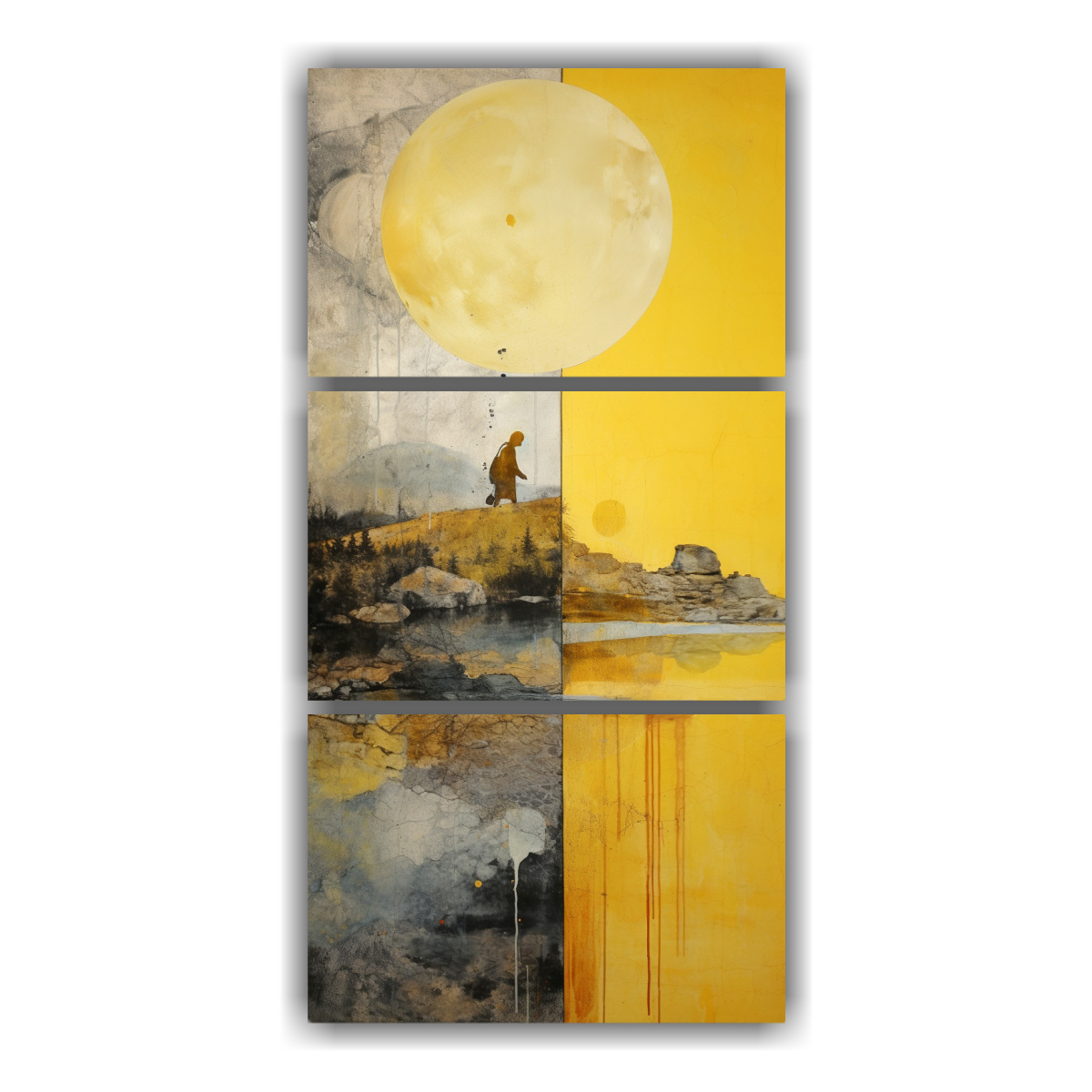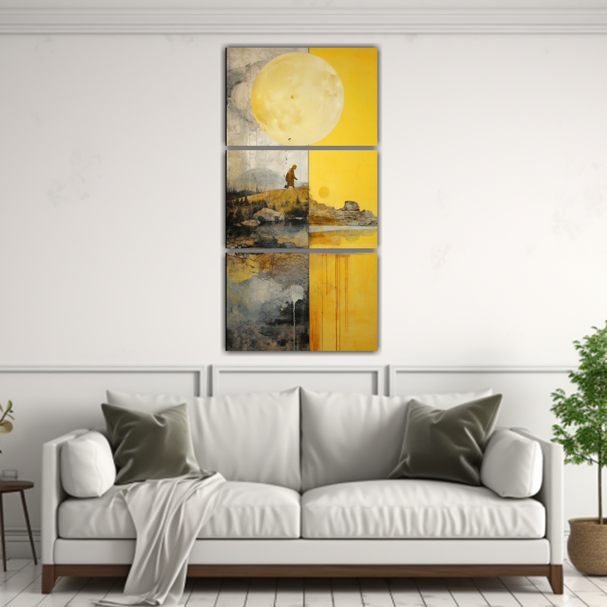 Este cuadro temático amarillo, verde azulado y plateado sería ideal para decorar un espacio de estilo moderno o contemporáneo, como la sala de estar o el estudio Combínalo con muebles en tonos neutros para resaltar sus colores vibrantes y crear un ambiente sofisticado