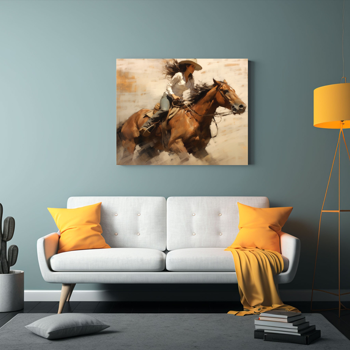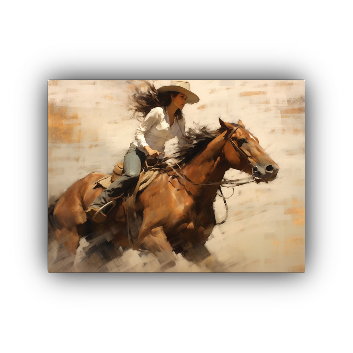 Descubre nuestro exclusivo diseño de mujer corredora de barriles en rodeo, ideal para dar un toque moderno a tu hogar Realizado en tela de alta calidad con bastidor de madera Envíos rápidos y gratis en Santiago, express a regiones