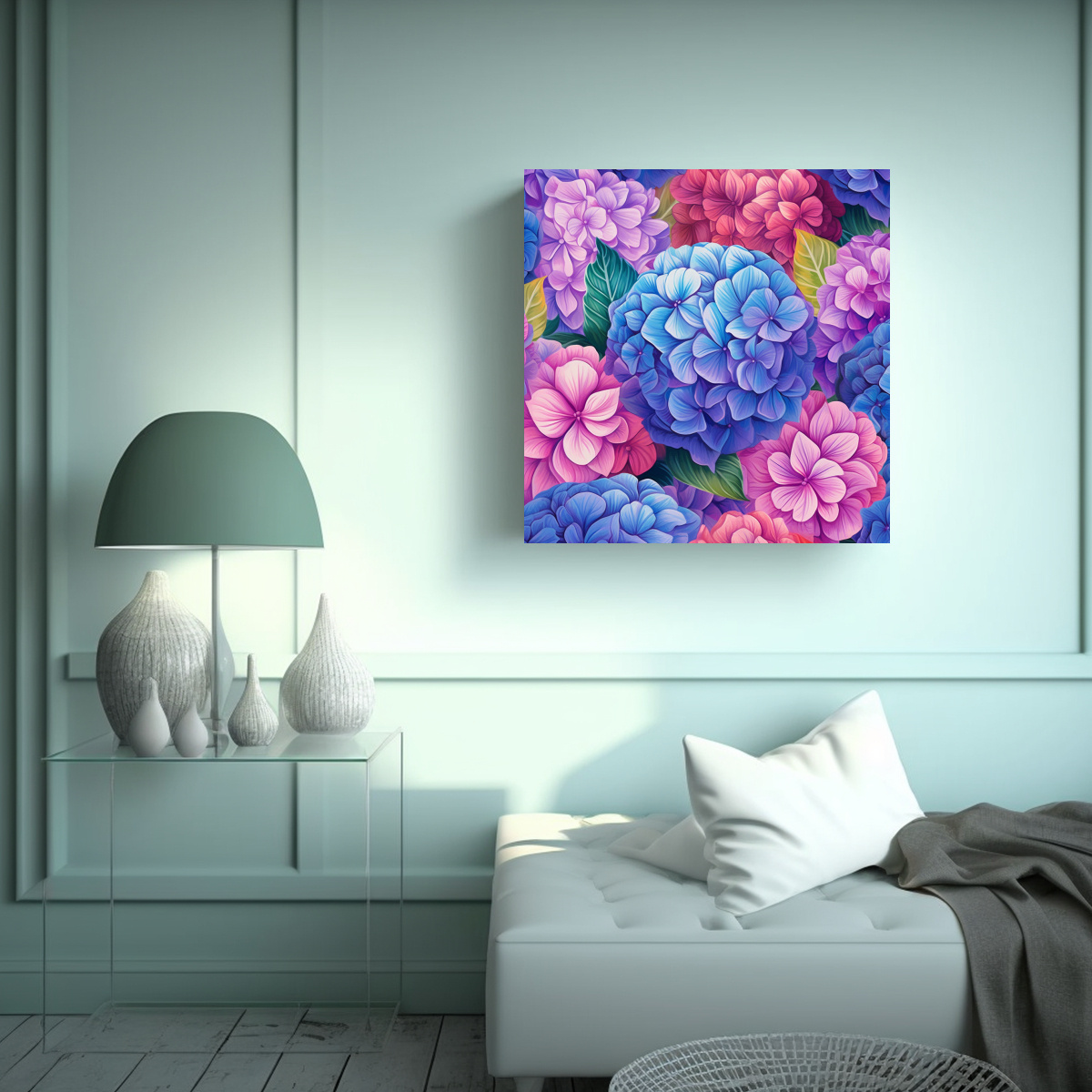 Decora tu hogar con el cuadro decorativo moderno de alta calidad ‘Sensibilidad Artística con Hydrangeas Vibrantes’ Nuestros cuadros impresos en tela de alta calidad con bastidores de madera harán que tus espacios cobren vida con su vibrante diseño de esquema hydrangeas pattern vibrant colors Los diseños exclusivos de nuestra tienda garantizan que tendrás un cuadro único en tu hogar Aprovecha nuestros precios económicos y disfruta de una entrega rápida y gratuita en Santiago, y envíos express a regiones