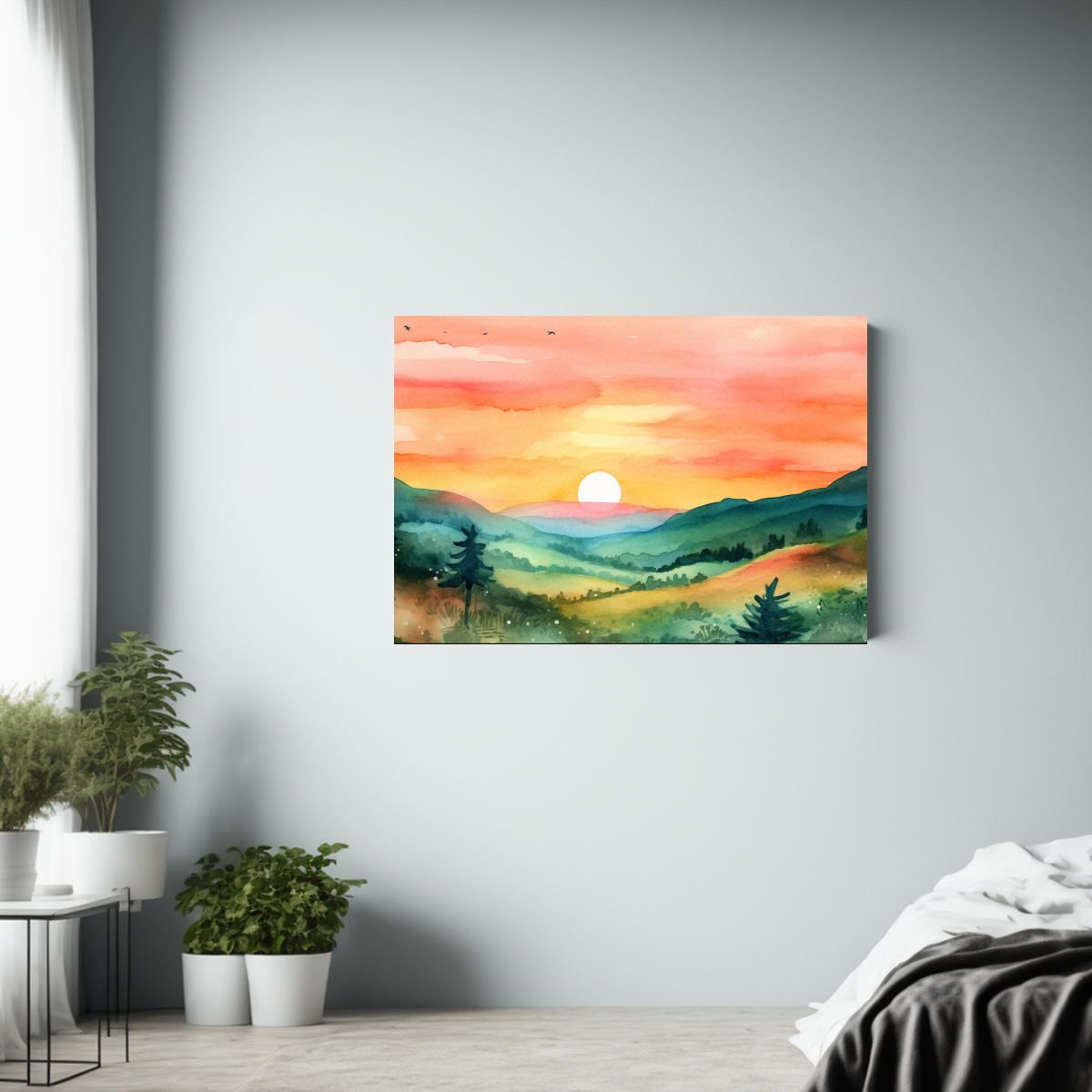 Cuadro Decorativo Paisaje Atardecer Sobre Colinas En Bastidor