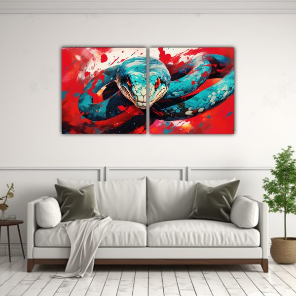 Dos canvas espectaculares con un neo pop art de un Python en colores rojo y turquesa Con detalles intrincados que resaltan en cada tono, desde el plateado hasta el gris Decora con estilo y originalidad tu espacio con este cuadro único