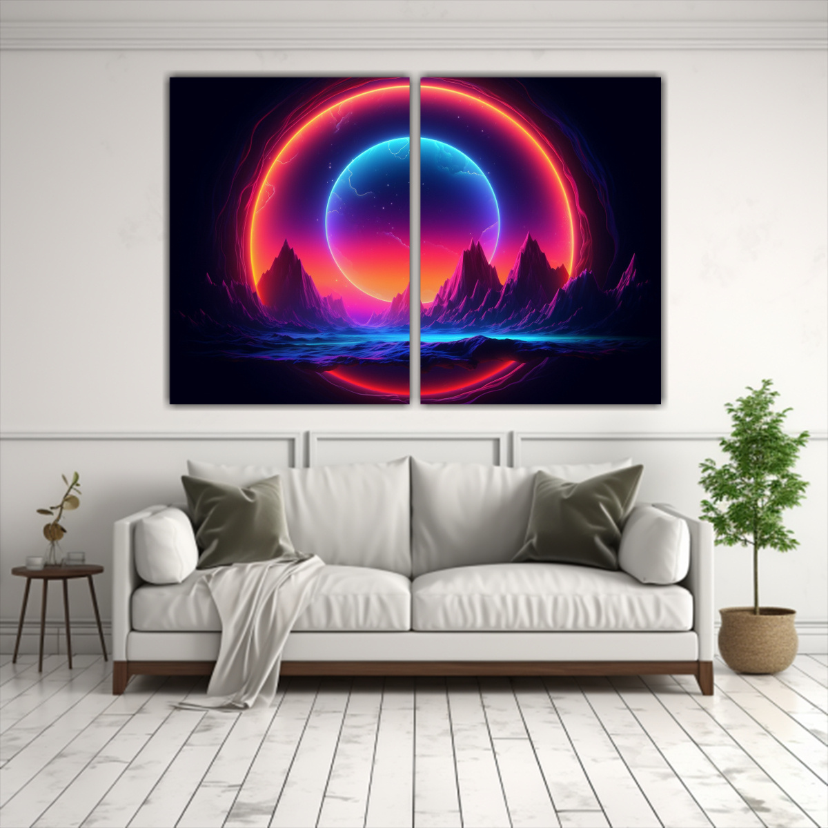 Cuadro Decorativo Rectangular Con Marco De Círculo Neon Sobre Paisaje Abstracto.