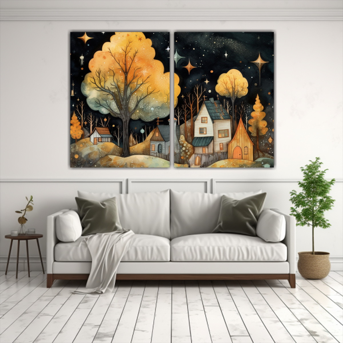 Cuadro Decorativo Rectangular De árboles, Casa Y Estrellas.