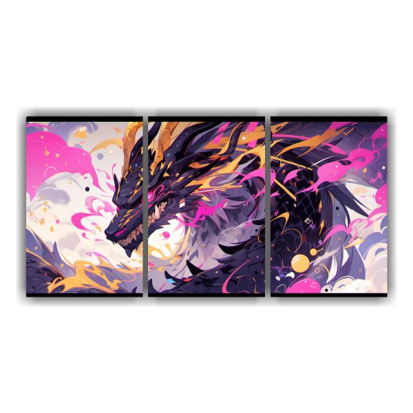 Cuadro Decorativo Relieve De Dragón En Colores Púrpura Y Dorado, Atmósfera Neonoir