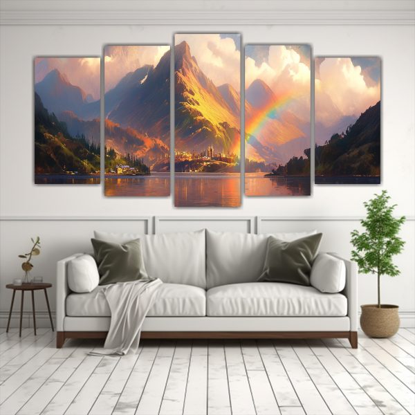 El Set 5 Lienzos Vintage Relieve a Lakeside Mountains with Rainbow and Gold Colors abstrae la naturaleza en tonos Gris, Azul Marino grisaceo, Beige, Chocolate, Coral y Plateado Dale un toque único a tu hogar