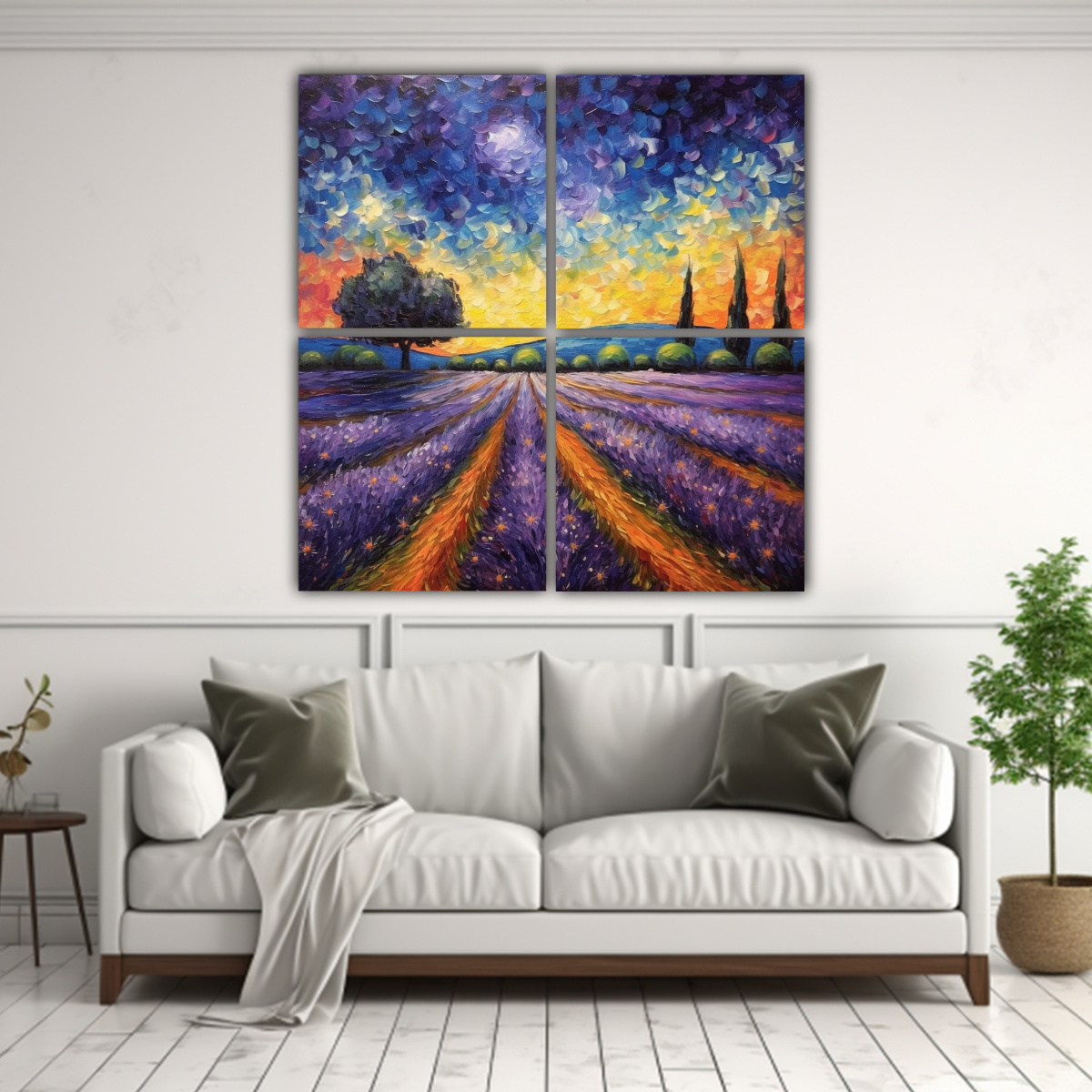 Coloca el cuadro decorativo campo de lavanda de noche sobre la cabecera de tu cama para crear un punto focal en tu dormitorio Combínalo con cojines en tonos azules y violetas para darle armonía a la decoración También puedes colocarlo en el recibidor para darle la bienvenida a tus invitados con un toque de arte ¡Deja volar tu imaginación y encuentra el lugar perfecto para este cuadro único en tu hogar!