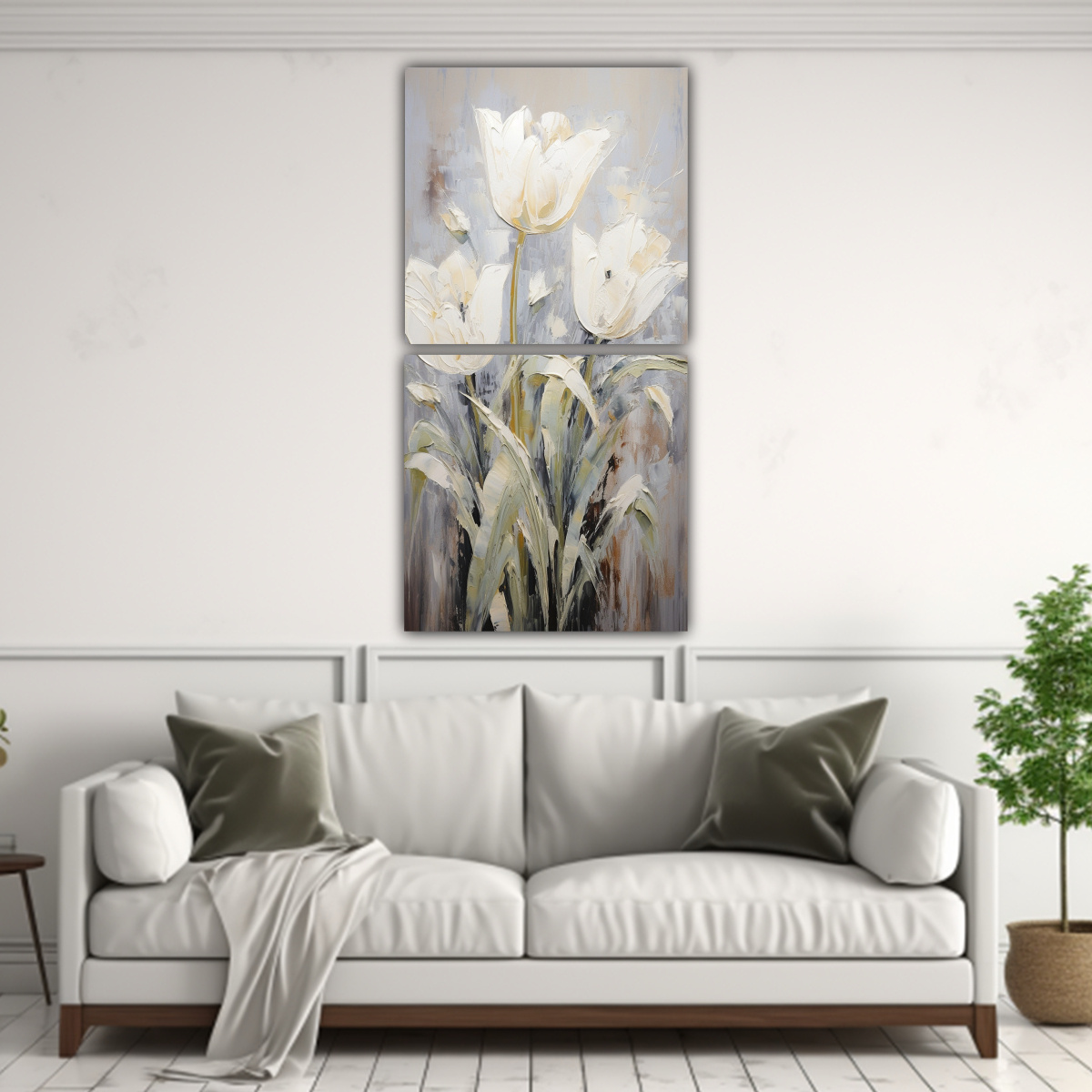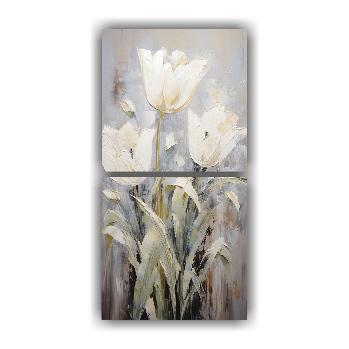 Este hermoso cuadro de Tulipanes Blancos estilo pintura sobre lienzo es ideal para agregar un toque de paz y serenidad a tu sala de estar o dormitorio Colócalo sobre un mueble en tonos neutros, como beige o gris, para resaltar los detalles intrincados en Plateado, Azul Marino grisaceo, Gris, Dorado y Beige Combínalo con cojines en tonos suaves y una cortina ligera para crear una atmósfera relajante y elegante en tu espacio