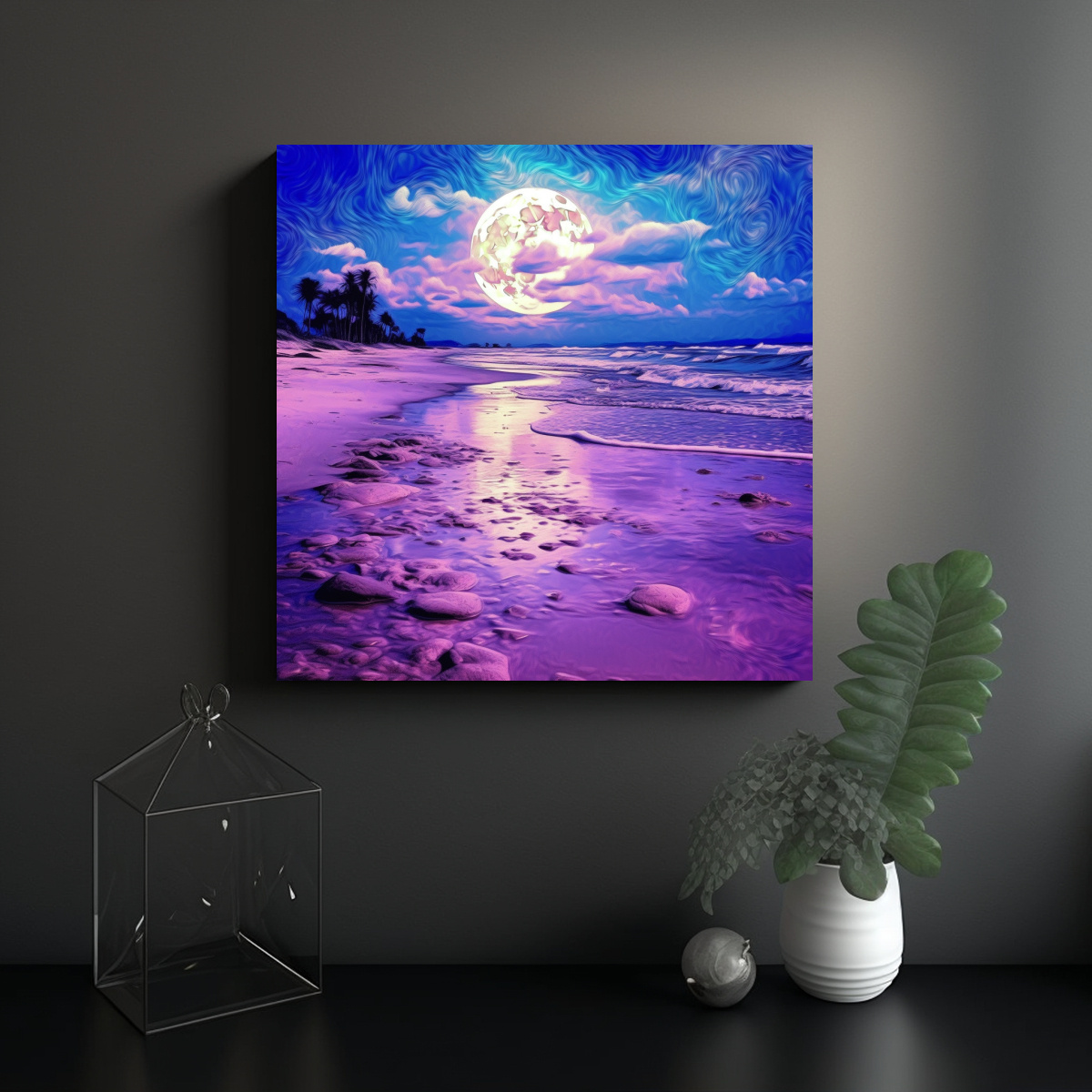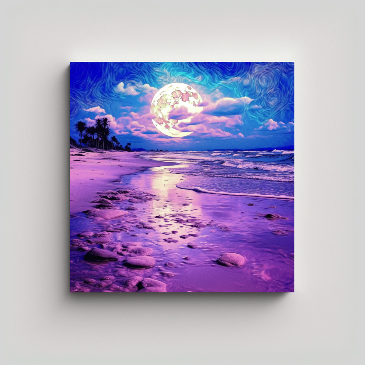 Agrega un toque de misterio y elegancia a tu espacio con este cuadro único Ideal para salas de estar, dormitorios o espacios de relajación Eleva la decoración de tu hogar con esta imagen inspiradora de la playa en la luna púrpura psicodélica