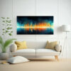 Este cuadro digital abstracto estilo lienzo futurista sería perfecto para decorar tu sala de estar o tu estudio Puedes colocarlo sobre un sofá de color neutro para resaltar los colores vibrantes del cuadro Además, puedes combinarlo con muebles de estilo moderno y elementos decorativos en tonos dorados para crear un ambiente sofisticado y vanguardista