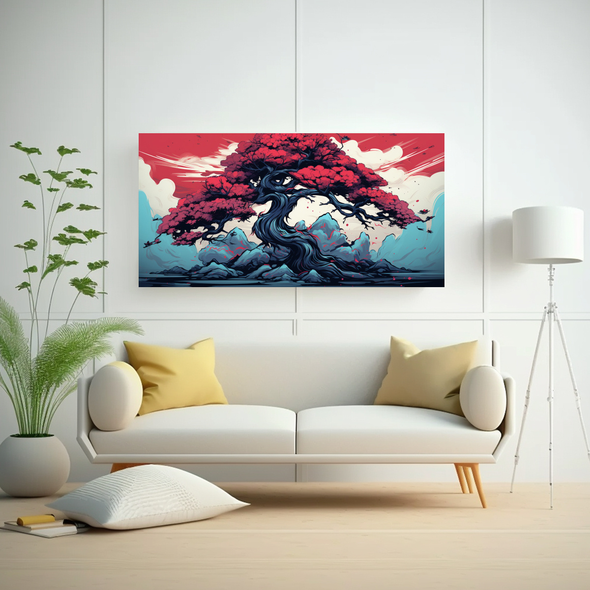 DecoCuadros te ofrece el Cuadro Diseño Elegante: Árbol Bonsái en Colores Rojo y Azul, con una atmósfera neonoir Impreso en tela de alta calidad y con bastidor de madera Disfruta de la exclusividad de nuestros diseños ¡Compra ya!