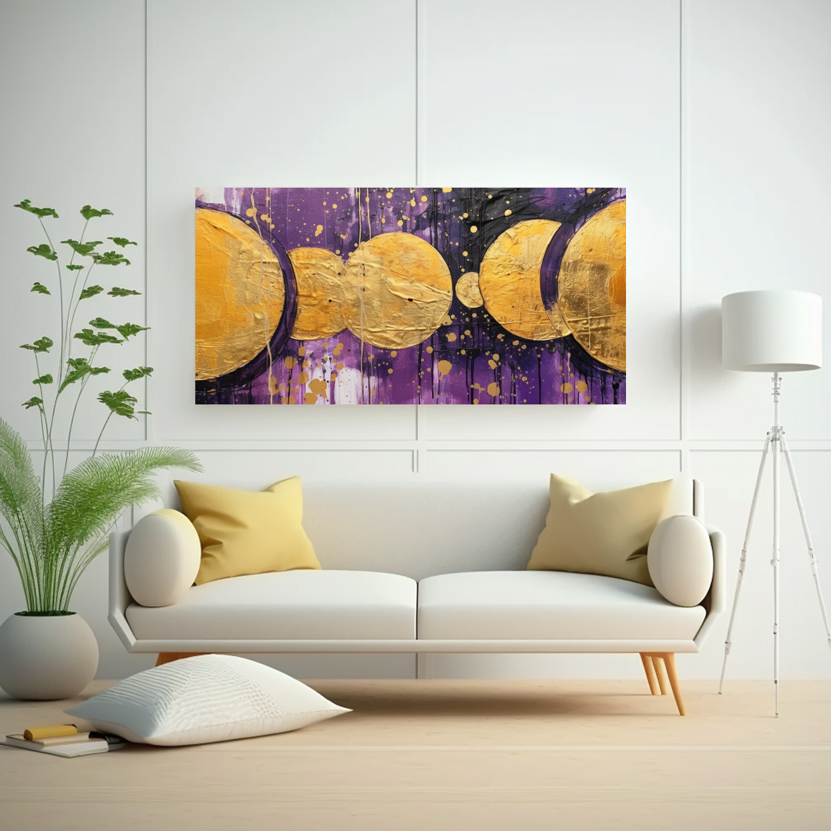 Para realzar la elegancia de este cuadro, colócalo en un ambiente con paredes blancas y muebles minimalistas en tonos neutros Sus círculos dorados brillarán y aportarán un toque de lujo a la decoración