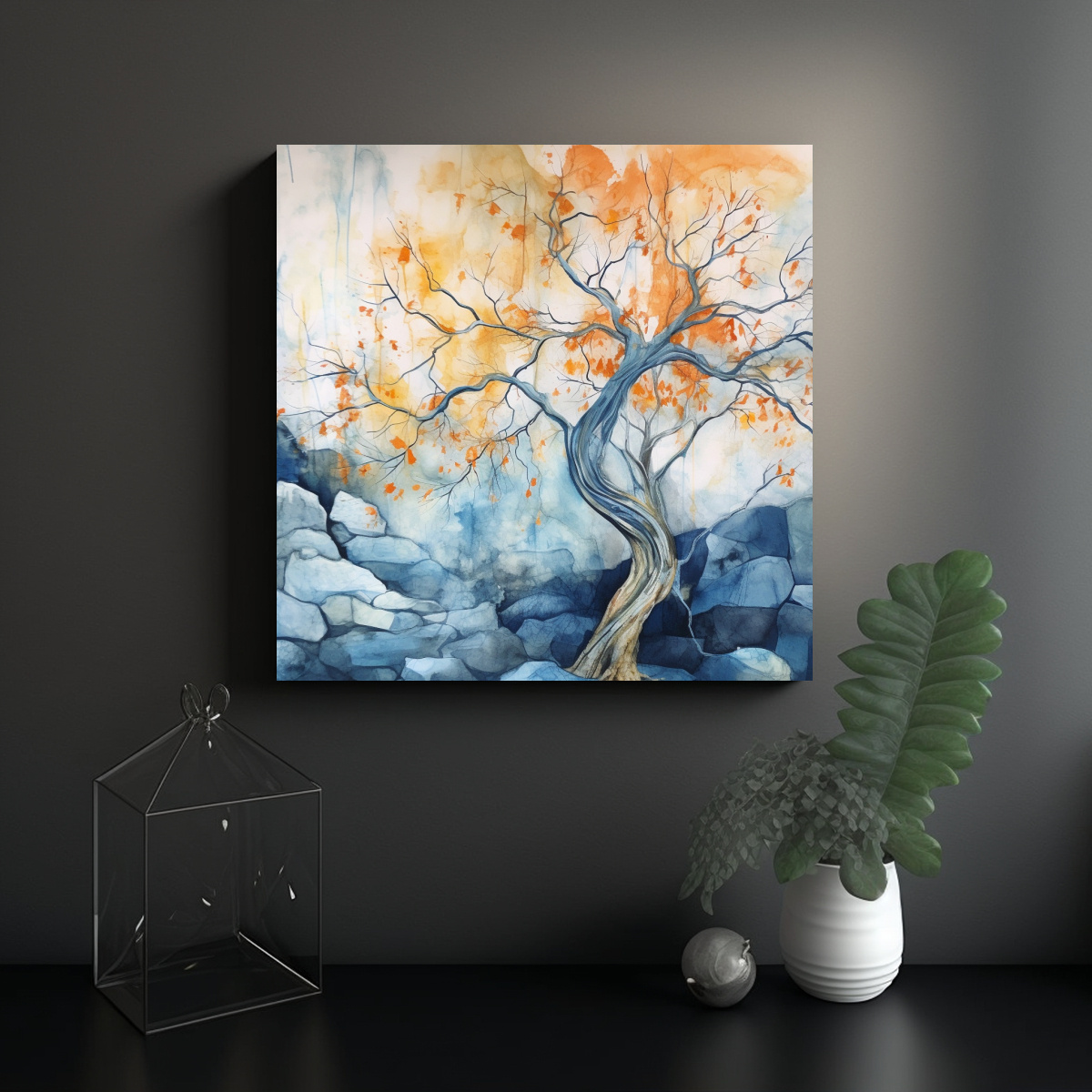 Cuadro En Bastidor: Árbol Azul Y Naranja Expresivo