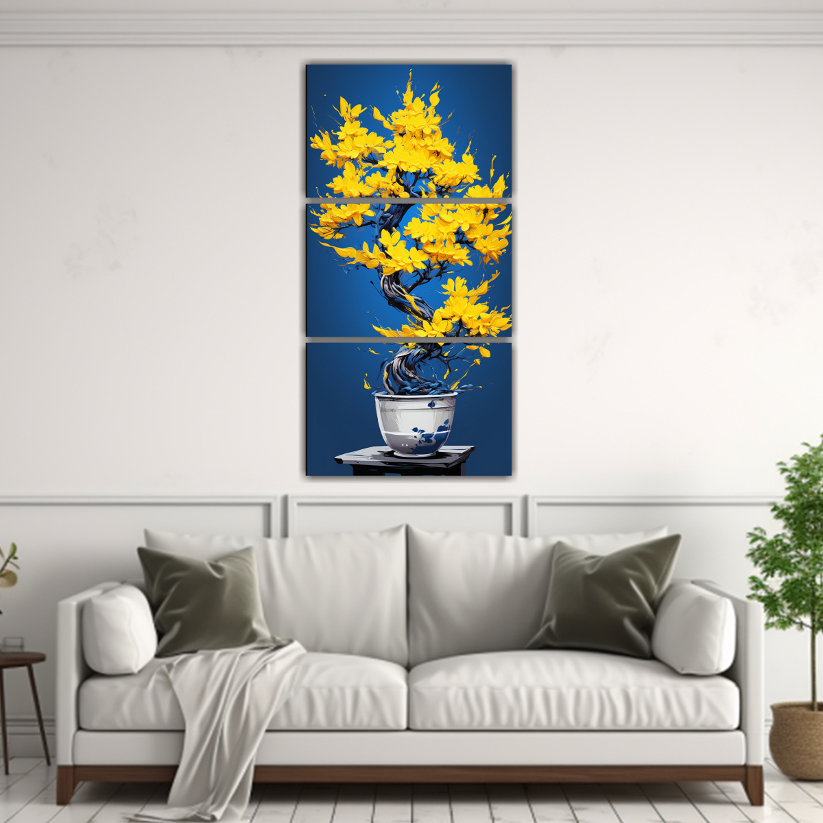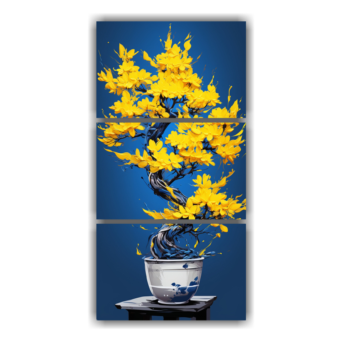 Dale un toque neo-noir a tu hogar con el Set 3 Telas en Bastidor con la imagen de un árbol bonsái en tonos amarillo y azul Calidad premium y entrega express a regiones