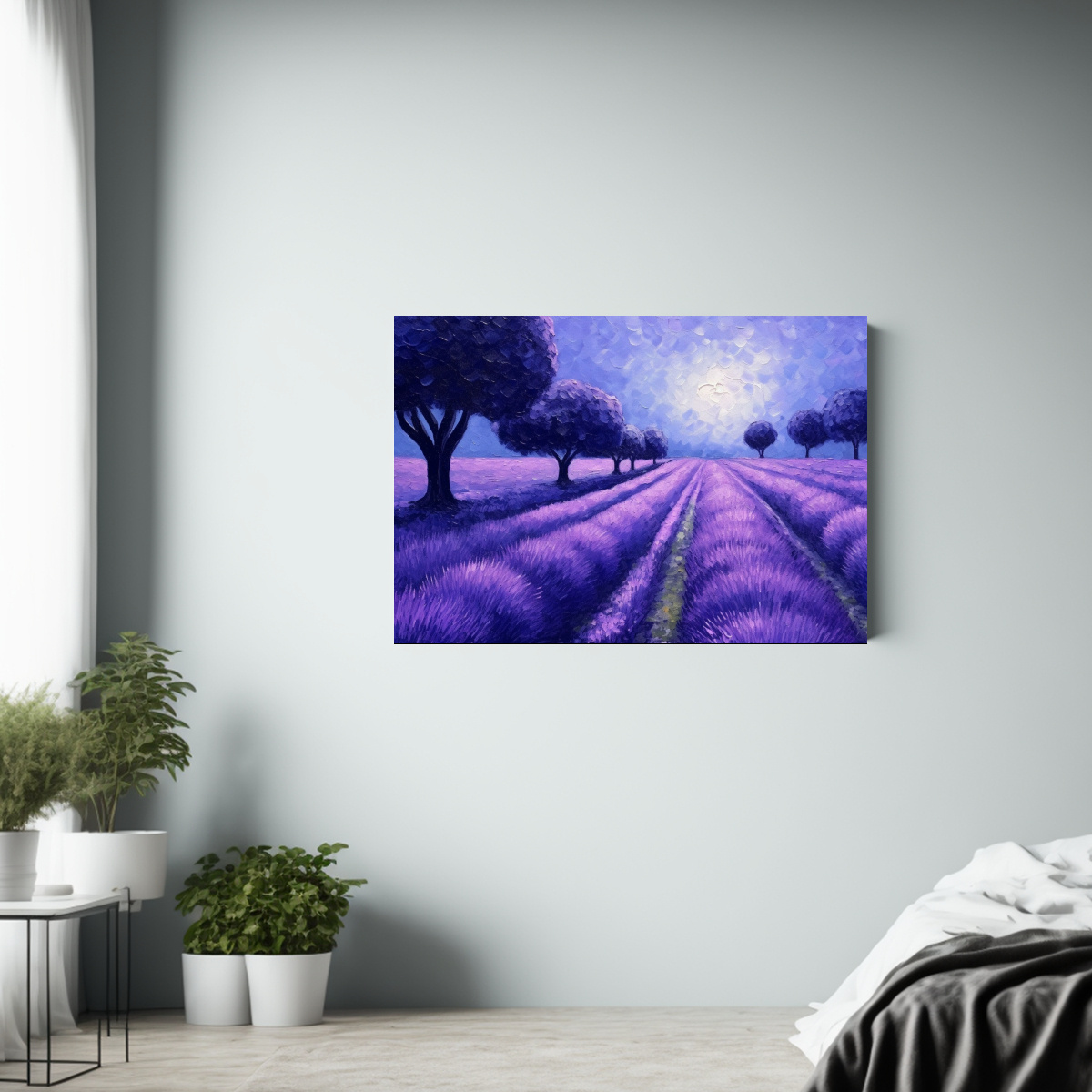 Este cuadro en bastidor de campo de lavanda nocturno se vería espectacular en tu sala de estar sobre un sofá color crema para resaltar los tonos lila y turquesa Combínalo con cojines en tonos violeta y gris para crear un ambiente armonioso y elegante