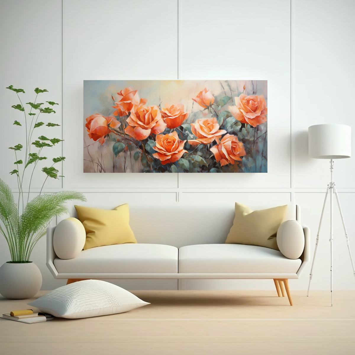 Este cuadro de rosas naranjas en bastidor es perfecto para decorar tu sala de estar o dormitorio, aportando calidez y elegancia Puedes colocarlo sobre una pared de color gris o beige para resaltar su belleza y combinarlo con muebles de tonos dorados o cálidos ¡Será el centro de atención en cualquier espacio!