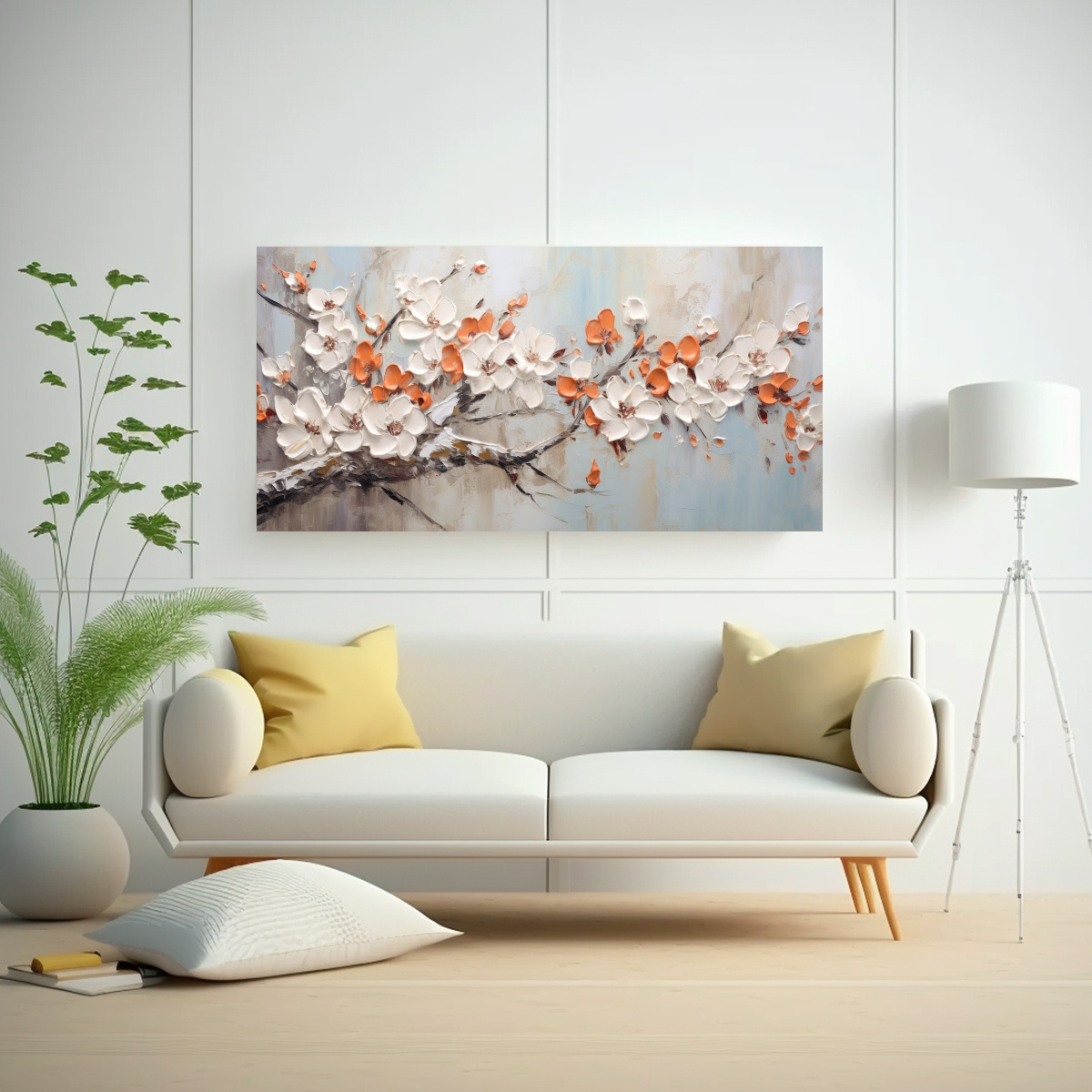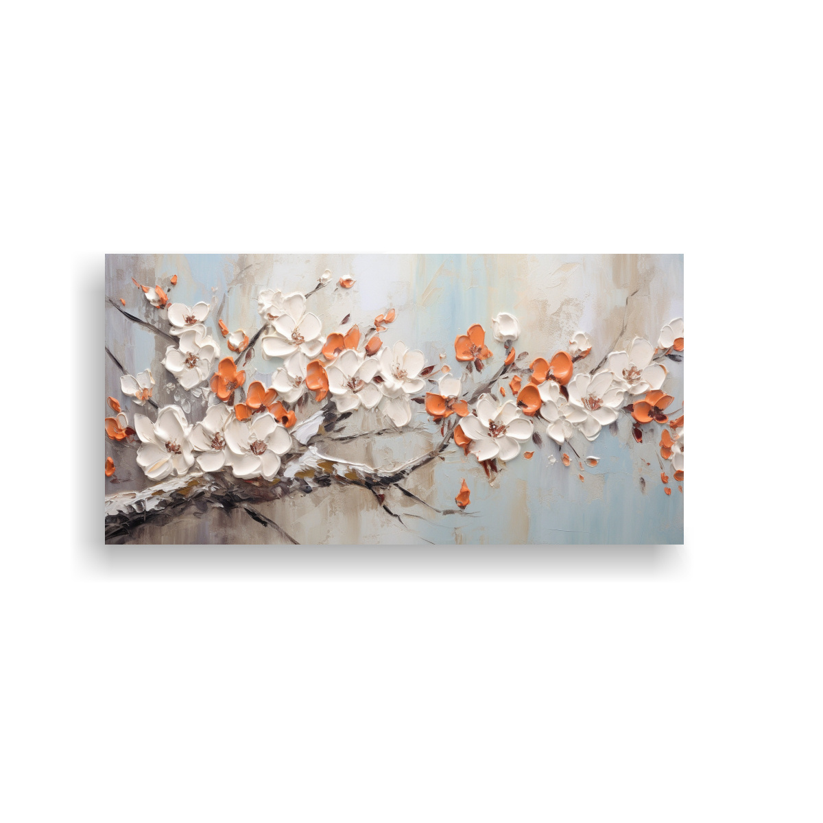 Este cuadro de flores de cerezo naranjas en lienzo sería perfecto para decorar el salón de tu hogar Colócalo sobre una pared de color beige o gris para resaltar los tonos cálidos de la imagen Combínalo con muebles y accesorios en tonos dorados para crear una atmósfera elegante y sofisticada