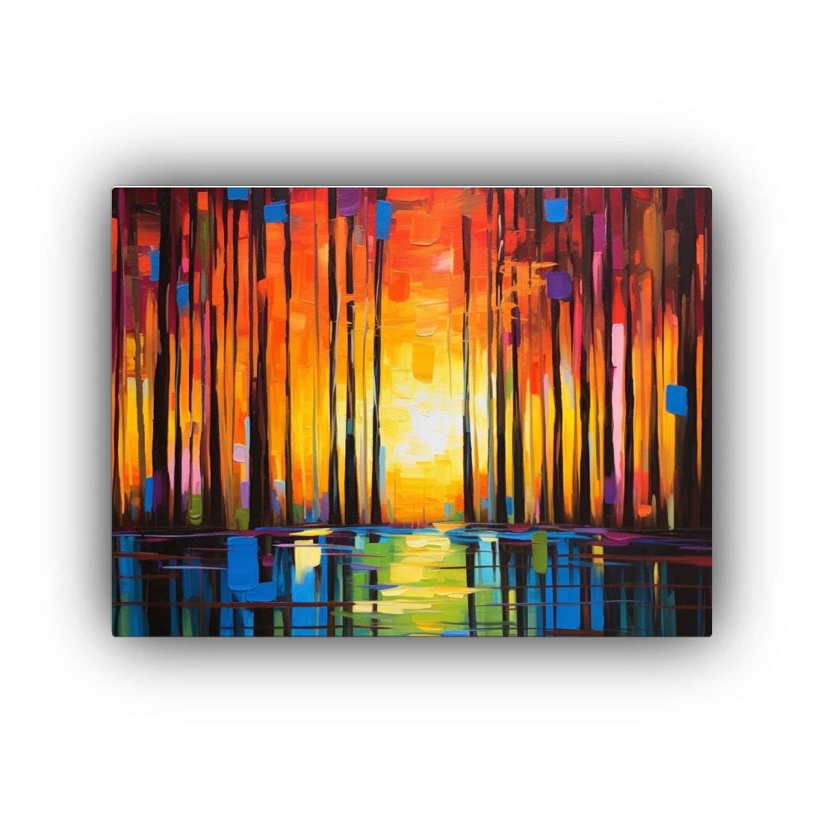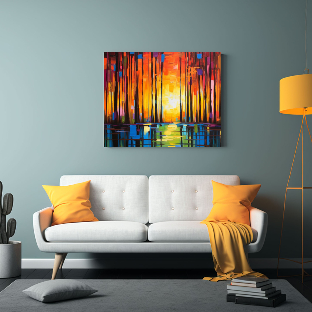 Renueva tu hogar con este cuadro en tela en bastidor vintage que captura la estética de un amanecer a través de los árboles Colores vibrantes como Carmesí, Amarillo Claro y Lila Envíos rápidos y gratuitos en Santiago, ¡adquiérelo ya!