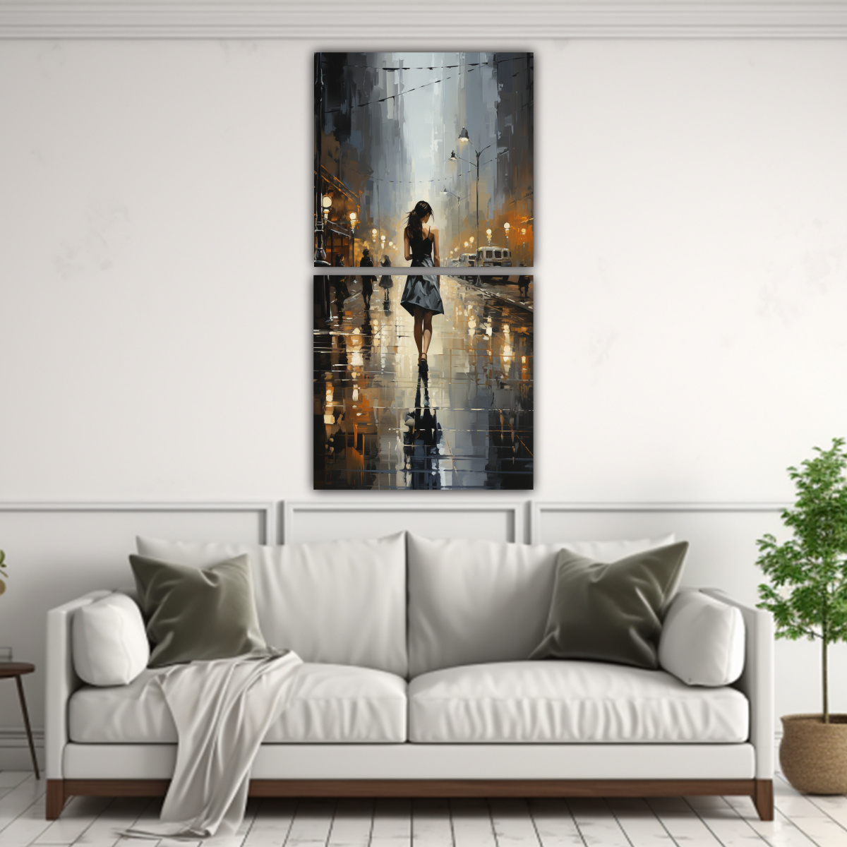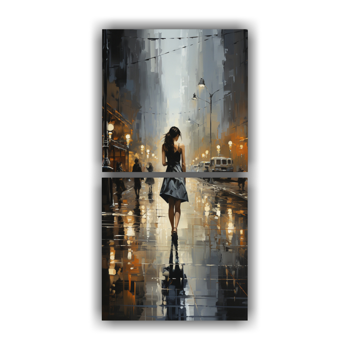 DecoCuadros tiene para ti el cuadro espectacular impresionista rectangular de hombre y mujer caminando Colores azul marino grisaceo, plateado, gris, chocolate y coral Nuestros cuadros son impresos en tela de alta calidad con bastidores de madera, y ofrecen diseños exclusivos que no encontrarás en ninguna otra tienda Además, te garantizamos la mejor calidad del mercado y los precios más económicos Realizamos entregas rápidas y gratuitas en Santiago, y enviamos a regiones de manera express