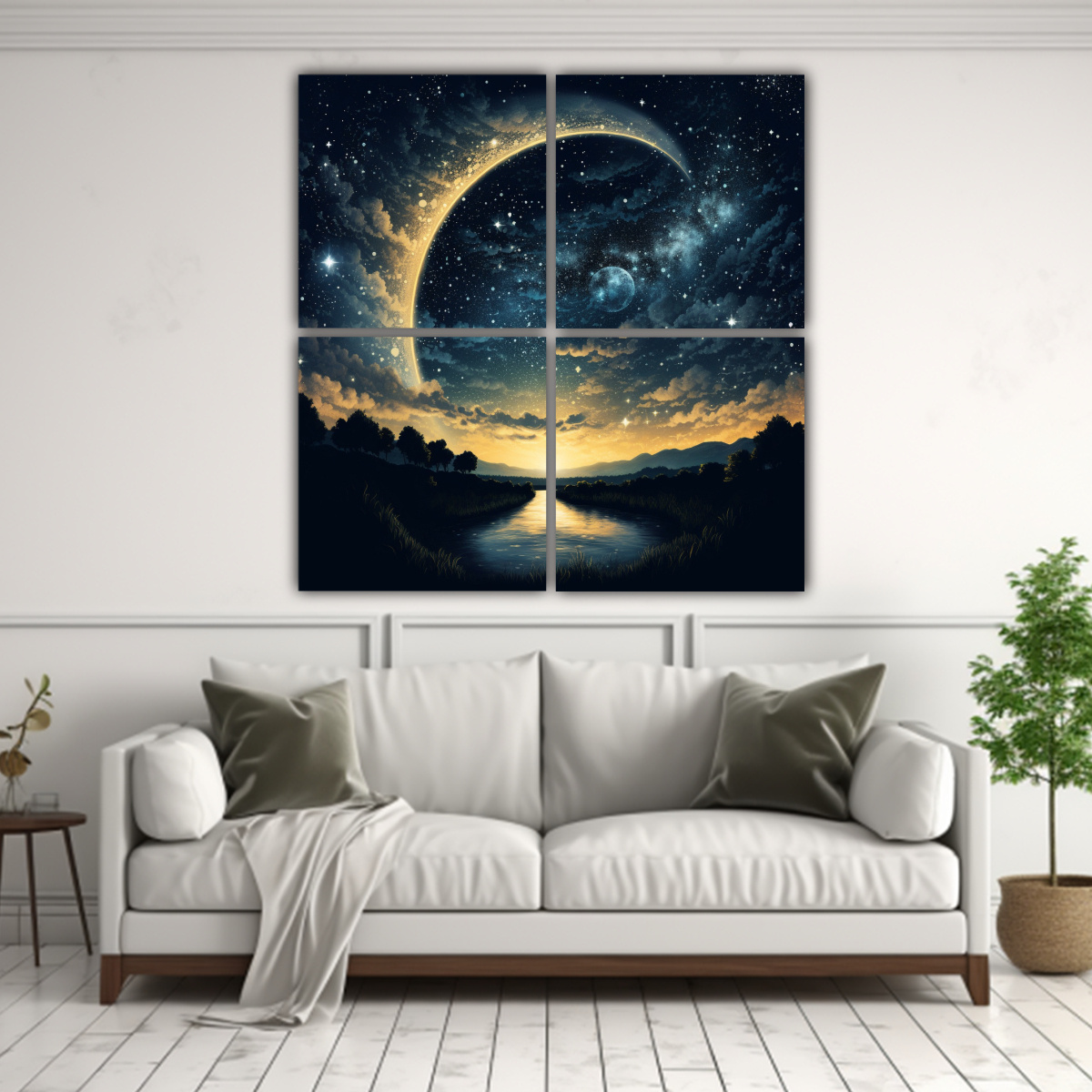 El cuadro estrellado con cielo estrellado y hermosa media luna de DecoCuadros es perfecto para darle un toque de elegancia y estilo a tus ambientes Su diseño exclusivo y los colores Coral, Negro, Gris, Azul Marino grisaceo, Turquesa y Plateado te brindarán un ambiente sofisticado y moderno