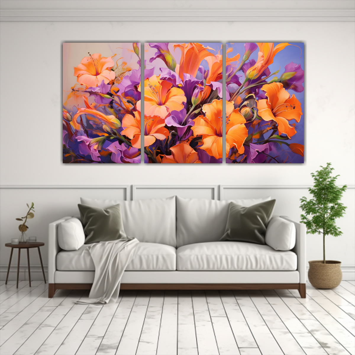 Cuadro Expresión Majestuosa Púrpura Y Naranja De Flores En Lienzo Para Decoración.