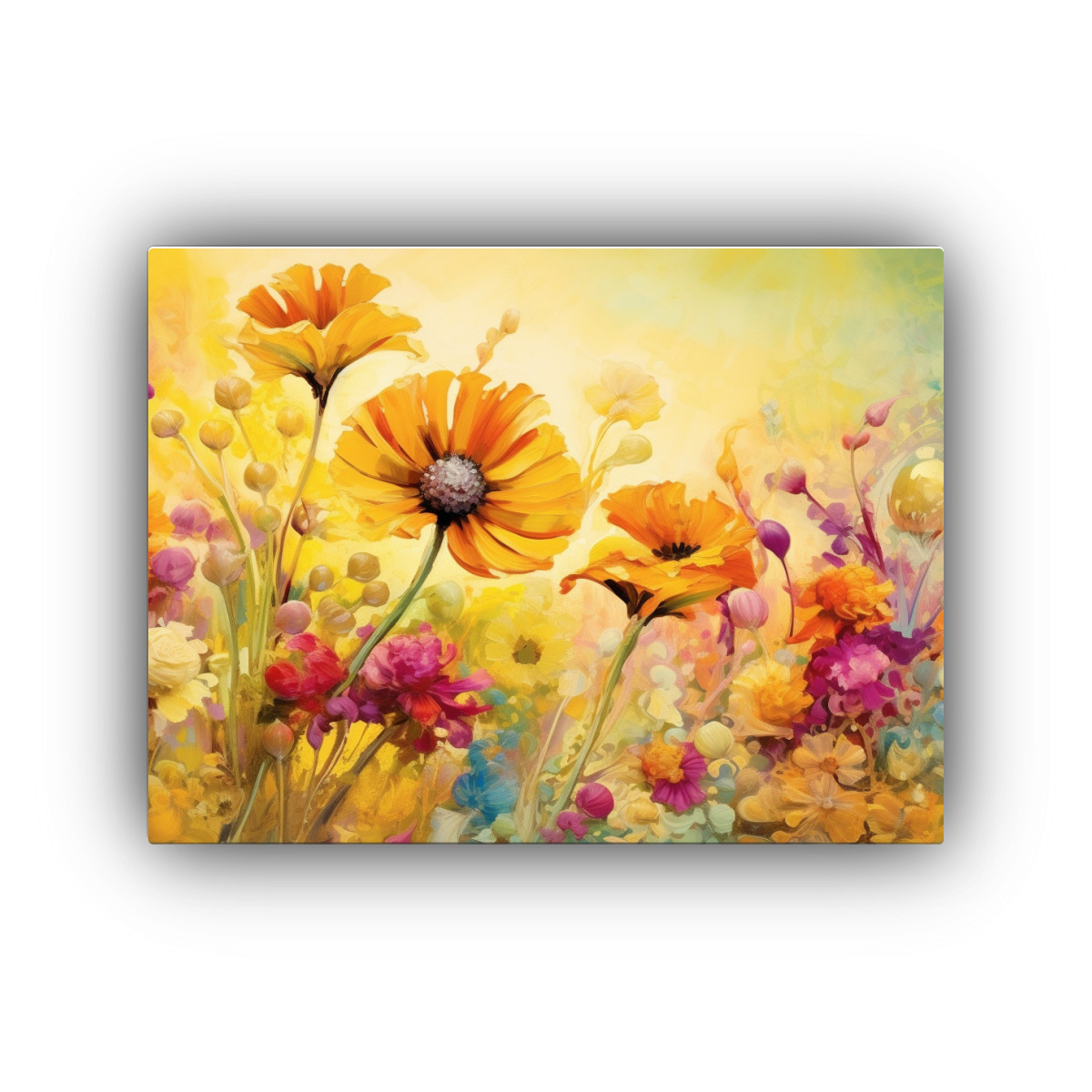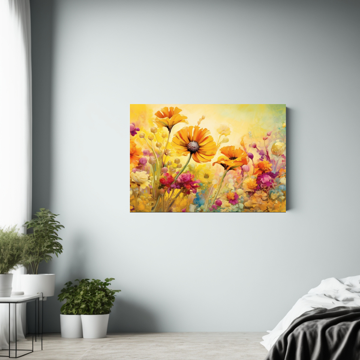 Este cuadro floral abstracto sobre fondo amarillo es perfecto para decorar tu sala de estar o dormitorio Combínalo con muebles de colores neutros como blanco o gris, y añade cojines en tonos dorados o corales para resaltar la elegancia y frescura de la obra de arte