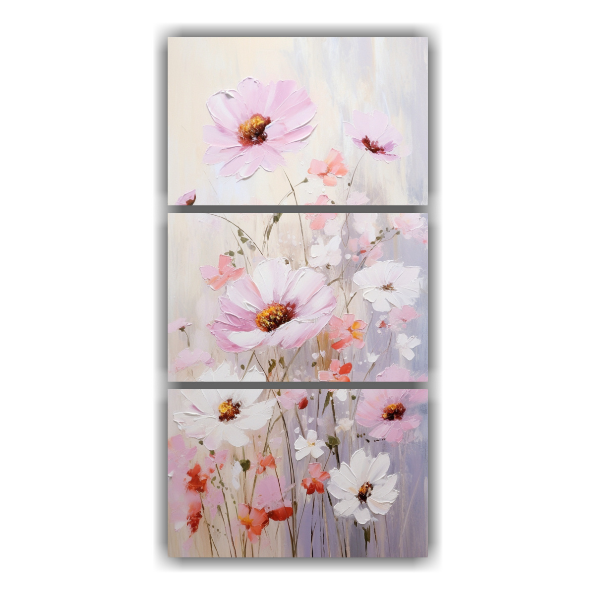 Cuadro Floral En Lienzo Blanco Y Rosa: Set De 3 Lienzos Vanguardistas