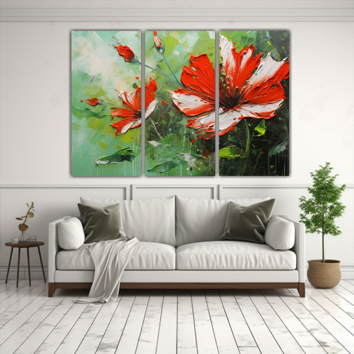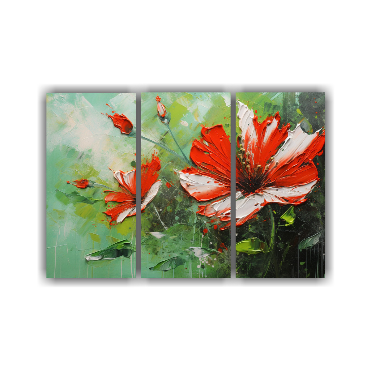 El set de 3 telas en bastidor destaca por su protagonismo en tonos verdes y rojos, ideal para añadir un toque de color y elegancia a tu hogar Disfruta de entregas rápidas y gratuitas en Santiago, con envíos express a regiones
