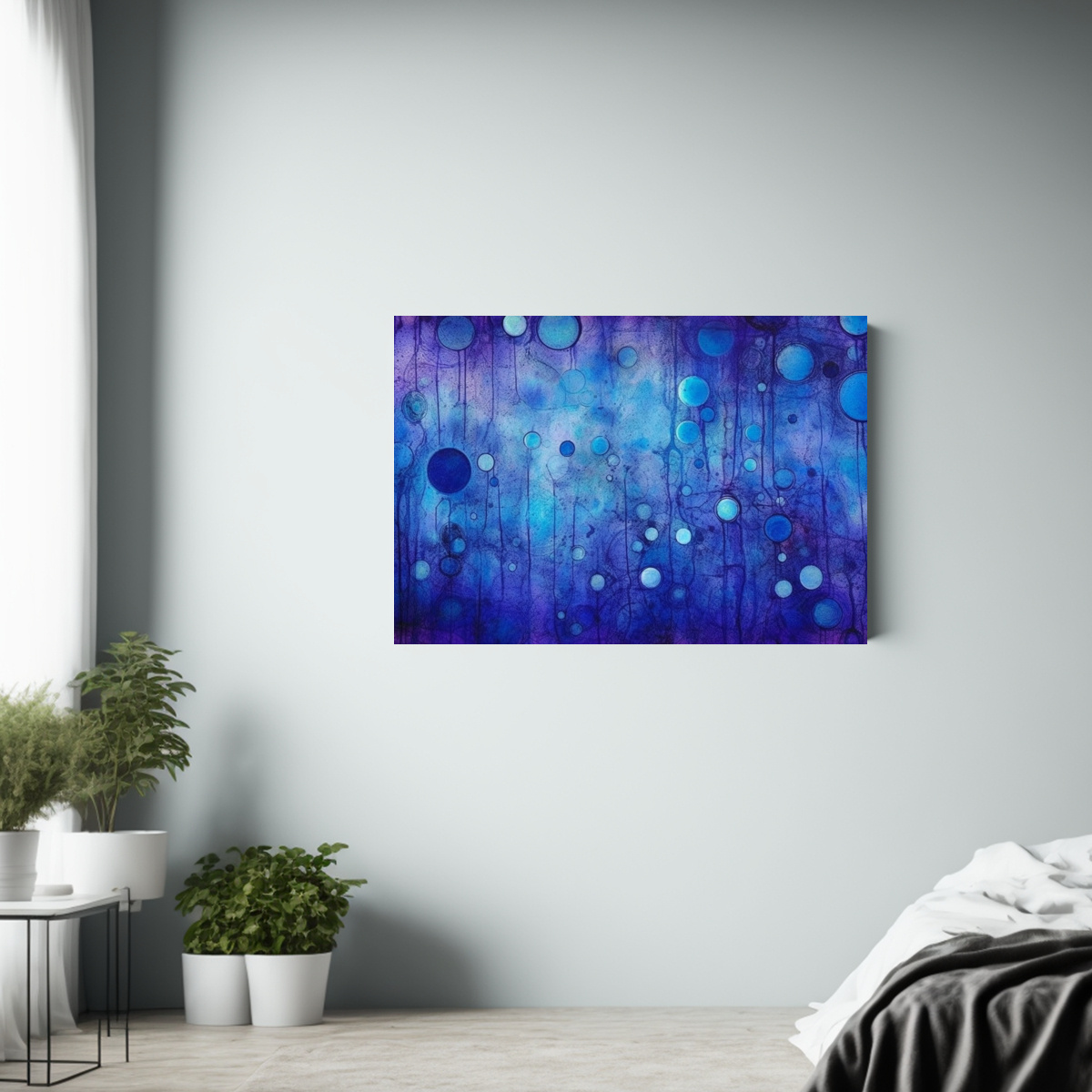 Para resaltar la belleza del Cuadro Fotografía Abstracto Azul en Estilo Lineal, colócalo en una pared blanca para que los colores resalten Combínalo con muebles en tonos neutros o grises para lograr un ambiente sofisticado y vanguardista