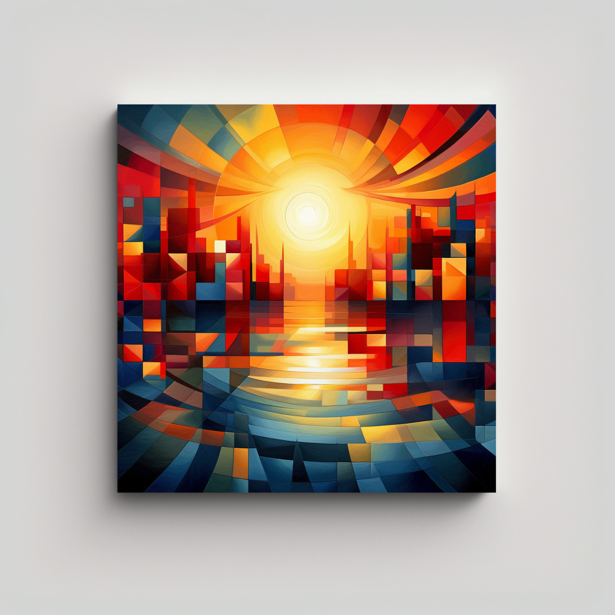 La imagen captura una hermosa puesta de sol en estilo cubista, donde los colores Carmesí, Azul Marino grisáceo, Amarillo Claro, Coral, Gris, Beige, Verde Azulado y Menta se combinan de manera única Con su diseño exclusivo, este cuadro es perfecto para añadir un toque especial a cualquier espacio