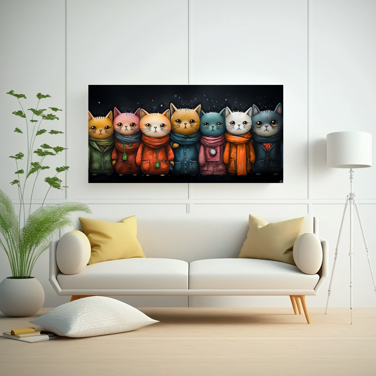 Agrega un toque único a tu hogar con este cuadro de gatos vestidos con suéteres en tonos Plateado, Gris y Carmesí Envío rápido y gratuito en Santiago, además de envíos express a regiones Renueva tu decoración con estilo y originalidad