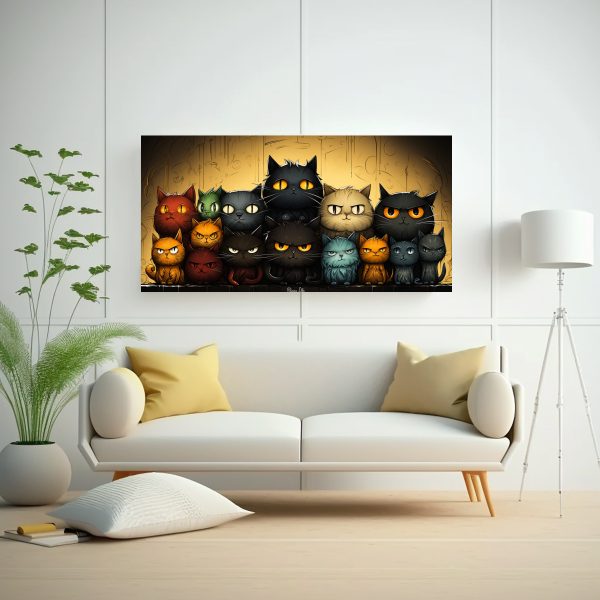 Este cuadro de gatos coloridos sobre fondo naranja es ideal para espacios modernos y alegres, como la sala de estar o el estudio Combínalo con muebles en tonos neutros para resaltar su viveza y añadir un toque de diversión a la decoración