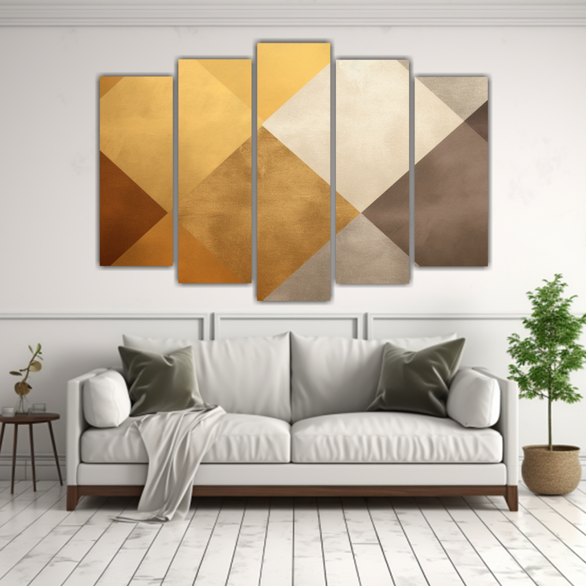 Coloca este cuadro geométrico en tonos oro y beige en tu sala de estar para crear un ambiente sofisticado Combínalo con muebles en tonos neutros como beige y gris, y añade cojines en amarillo claro para lograr una decoración armoniosa y elegante