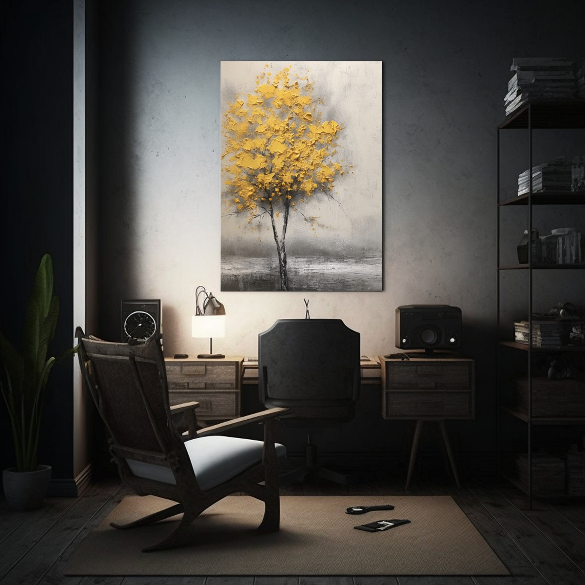 Este cuadro sería perfecto para decorar una sala de estar o un dormitorio con un estilo moderno Colócalo sobre un sofá gris o una cama blanca para resaltar los colores vibrantes del árbol amarillo También puedes combinarlo con cojines o cortinas en tonos amarillos o neutros para lograr un ambiente armonioso y lleno de energía