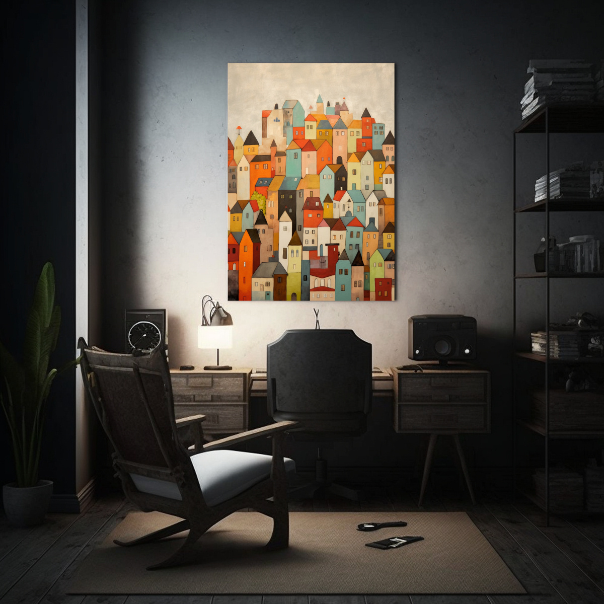 Este cuadro sería perfecto para decorar un salón o una sala de estar Combínalo con muebles de colores neutros como beige o blanco, y agrega cojines en tonos coral y mostaza para crear un ambiente acogedor y moderno