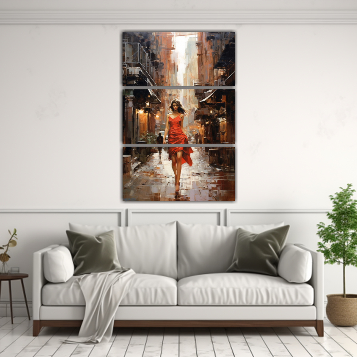Cuadro Horizontal Armonía De Tres Canvas De Una Mujer Caminando Por Una Calle De Ladrillos.