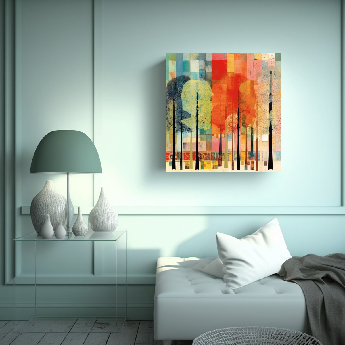 Este cuadro impactante estilo Robert Rauschenberg con composición hermosa de árboles re es perfecto para decorar tu sala de estar Coloca este cuadro en una pared de color neutro para que los colores azul marino grisáceo, plateado, carmesí, coral, beige, gris, amarillo claro y menta resalten aún más Combínalo con muebles modernos y accesorios en tonos neutros para crear una atmósfera sofisticada y elegante