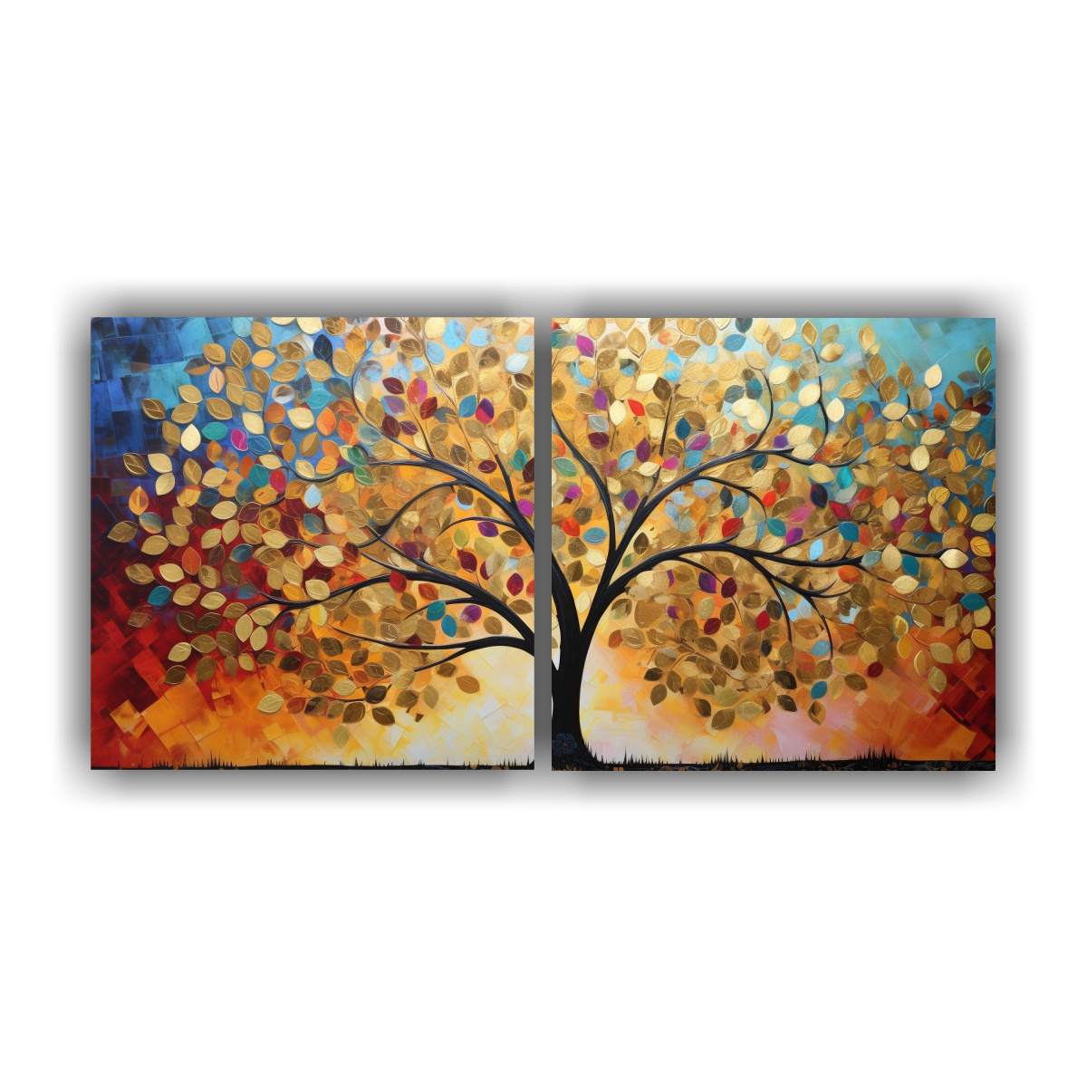 El Cuadro Impreso Árbol Dorado y Arcoíris en Sencillo es una opción ideal para darle vida a tus paredes Con colores vibrantes como el Azul Marino grisáceo, Dorado, Chocolate, Plateado, Amarillo Claro, Coral y Turquesa, este cuadro añadirá un toque de alegría y elegancia a cualquier ambiente