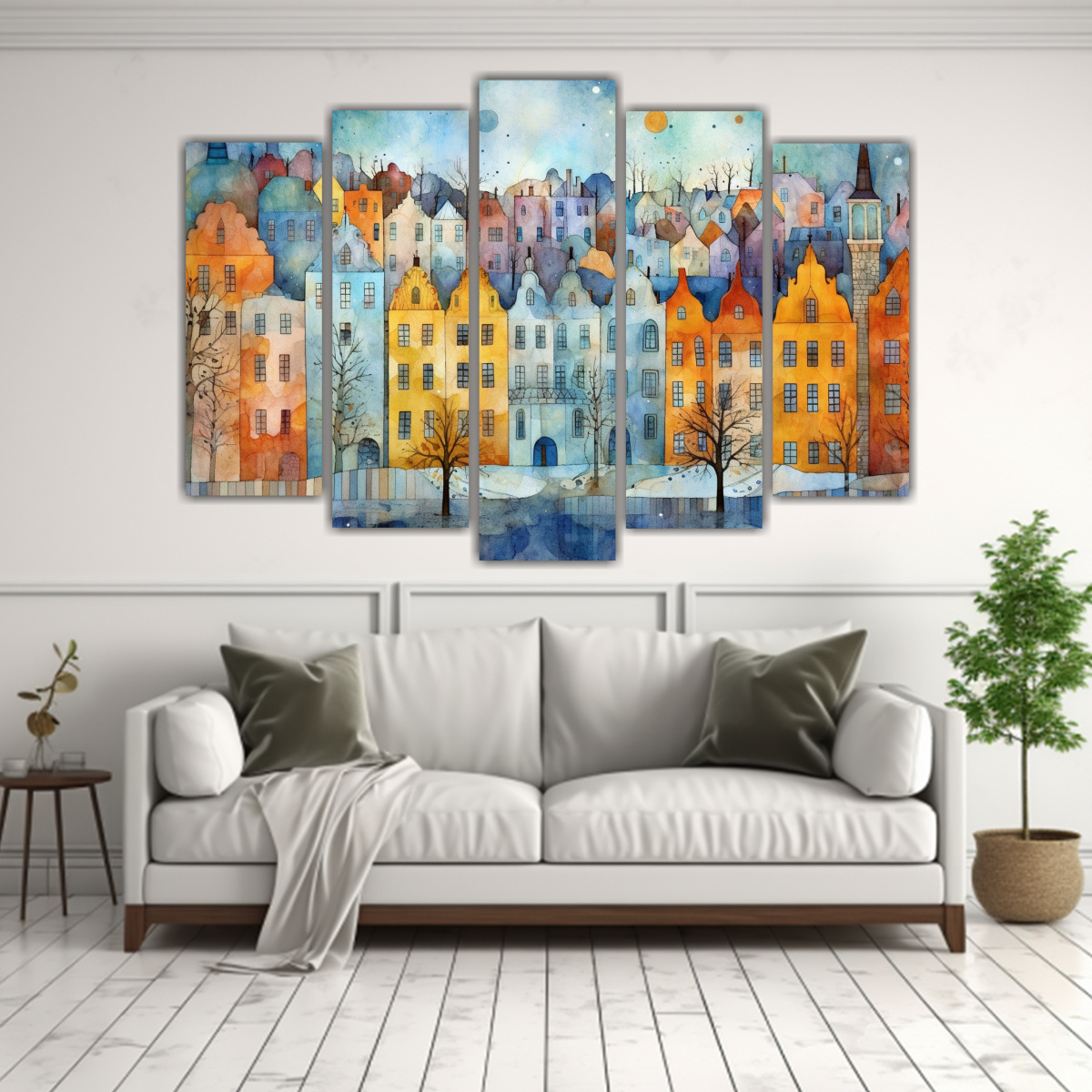 Añade un toque de elegancia con este cuadro en tonos Gris, Azul Marino grisaceo, Coral, Plateado, Chocolate y Menta Renueva tus espacios con este diseño único de ciudad sueca acuarela ¡Haz tu pedido ahora!