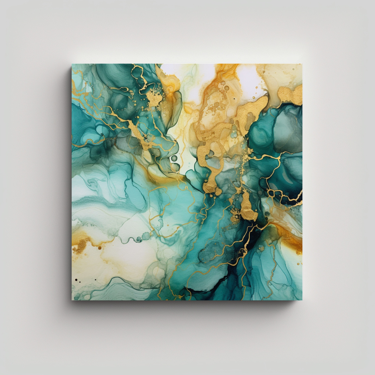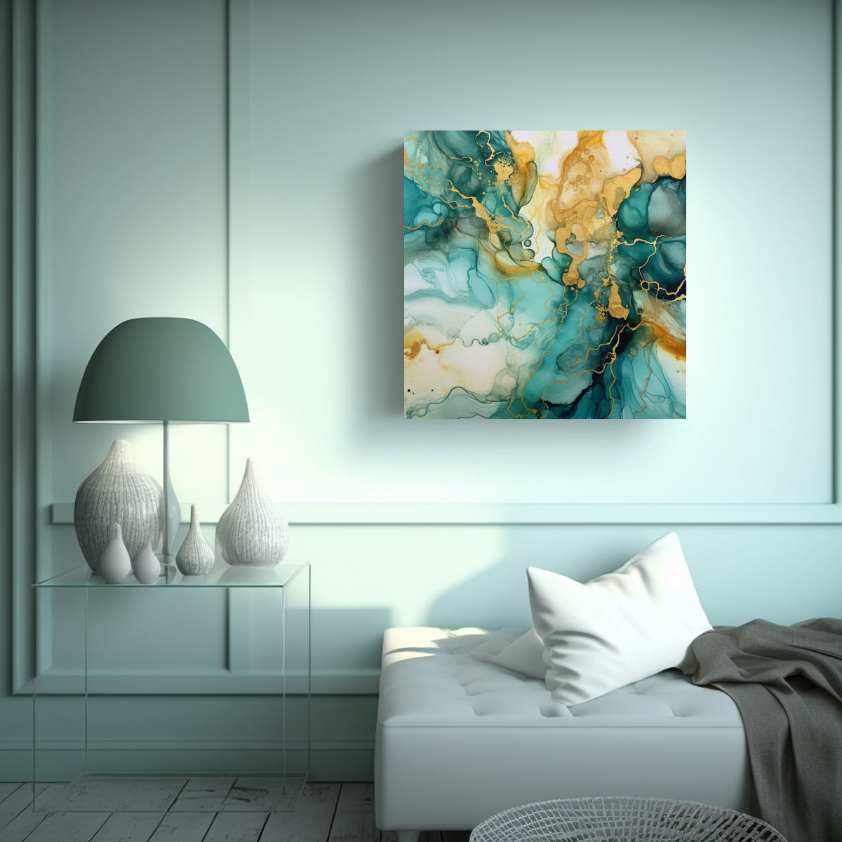 DecoCuadros te presenta el Cuadro Inspiración Living M tinta alcohol acuarela y línea dorada 8k, con una combinación de colores plateado, azul marino grisaceo, menta, gris, coral, turquesa y chocolate Esta obra de arte impresionante está impresa en tela de alta calidad y montada en un bastidor de madera Añade un toque de elegancia y estilo a tu hogar con este cuadro único