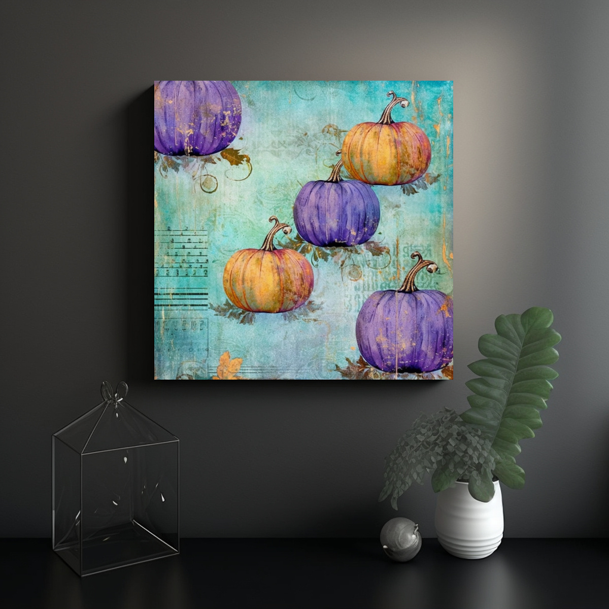 Cuadro Inspiración Surrealista Estilo Shabby Chic Con Calabazas Moradas Y Azules.
