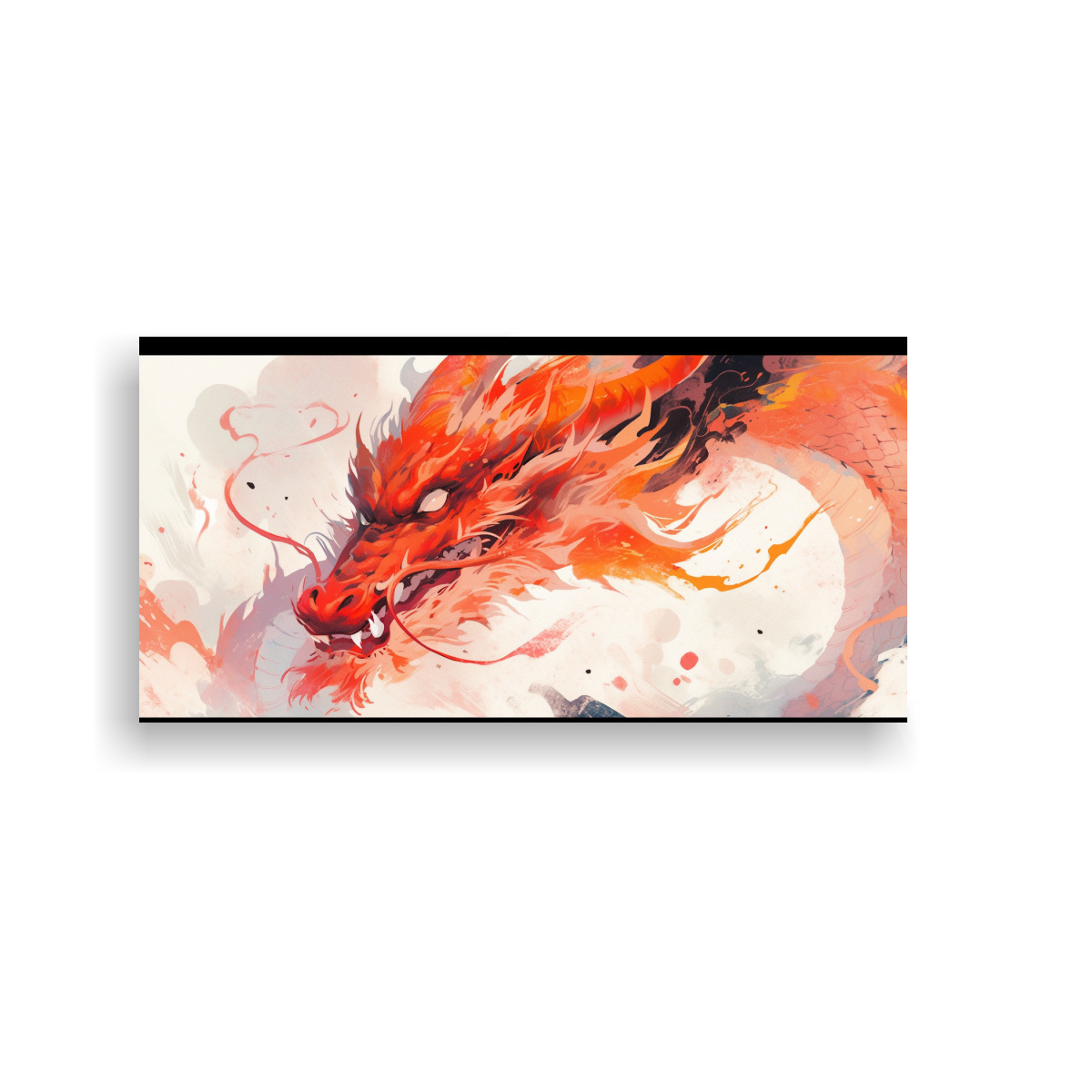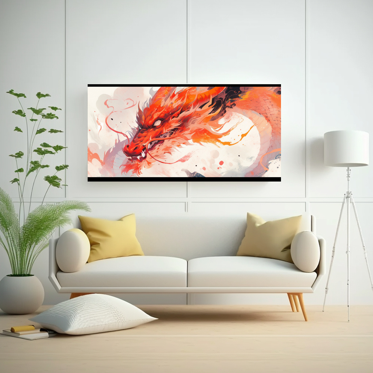 Coloca este fascinante cuadro de Dragón en Acuarelas y Naranja en la sala de estar sobre un sofá gris para crear un contraste moderno y atractivo Combínalo con cojines en tonos neutros y accesorios en negro para resaltar su belleza