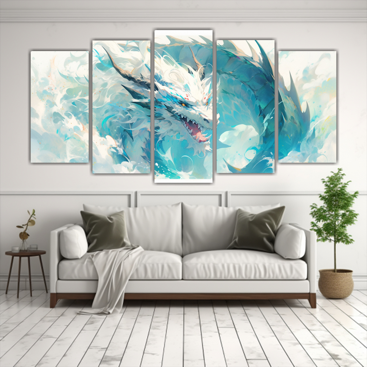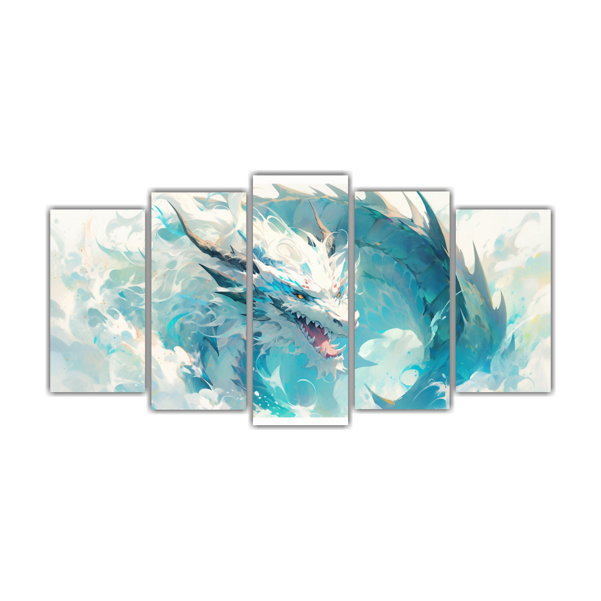 Cuadro Juvenil De Arte Pop Neo En Colores Turquesa Y Acuarela Con Un Dragón Set De 5 Pinturas Decorativas