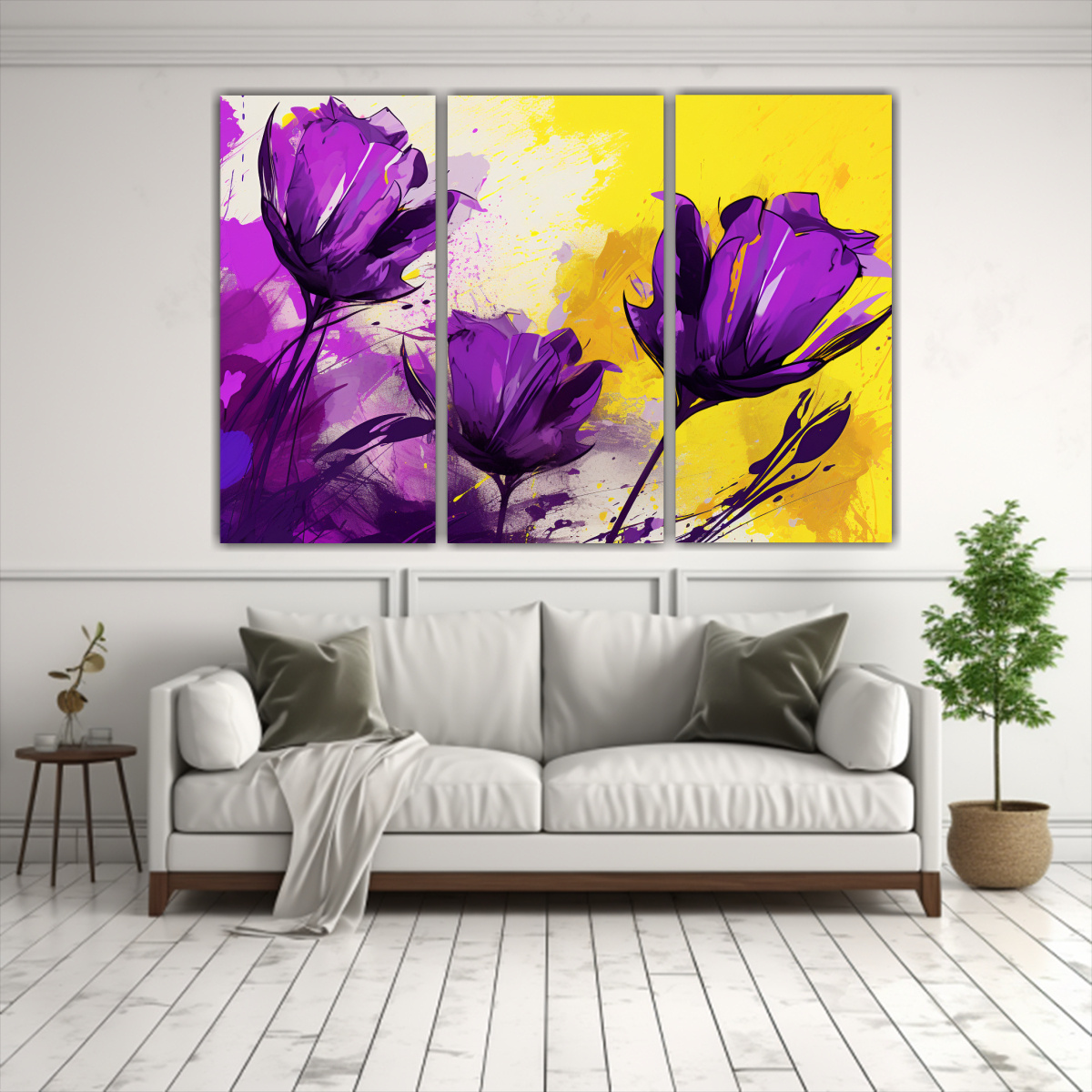 Coloca este Cuadro Juvenil en Amarillo y Morado en la pared principal de tu sala de estar y complementa con cojines en tonos amarillos y morados en el sofá Añade una alfombra gris para equilibrar los colores y crear un ambiente armonioso y moderno