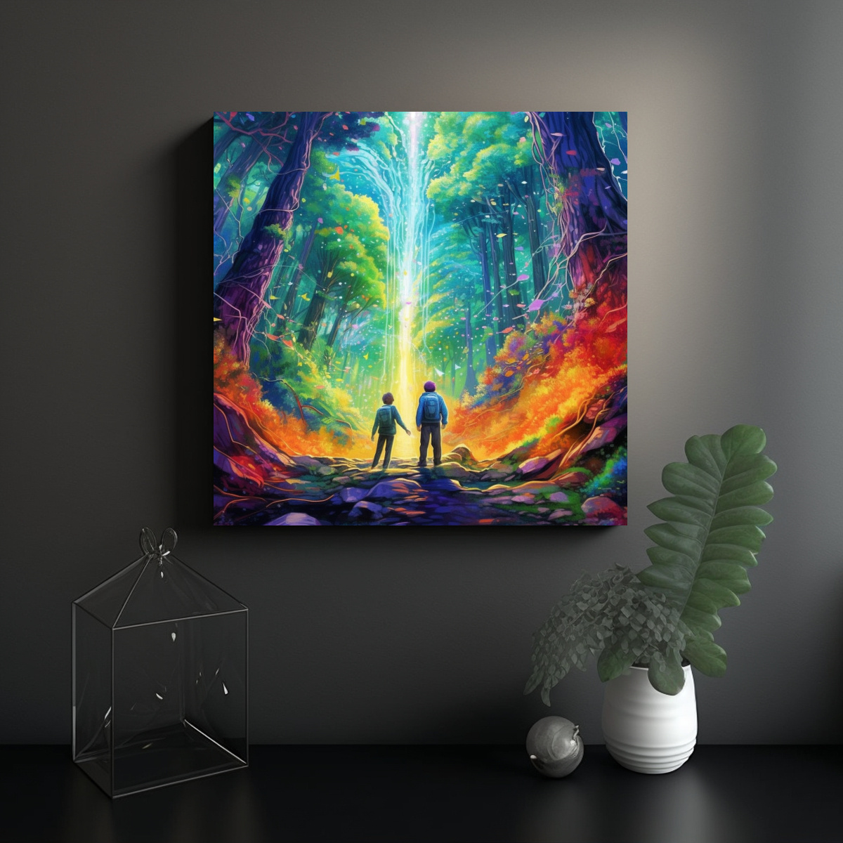 Cuadro Lienzo Abstracción: 2 Niños Caminan Hacia Fénix Arcoíris En Paisaje.