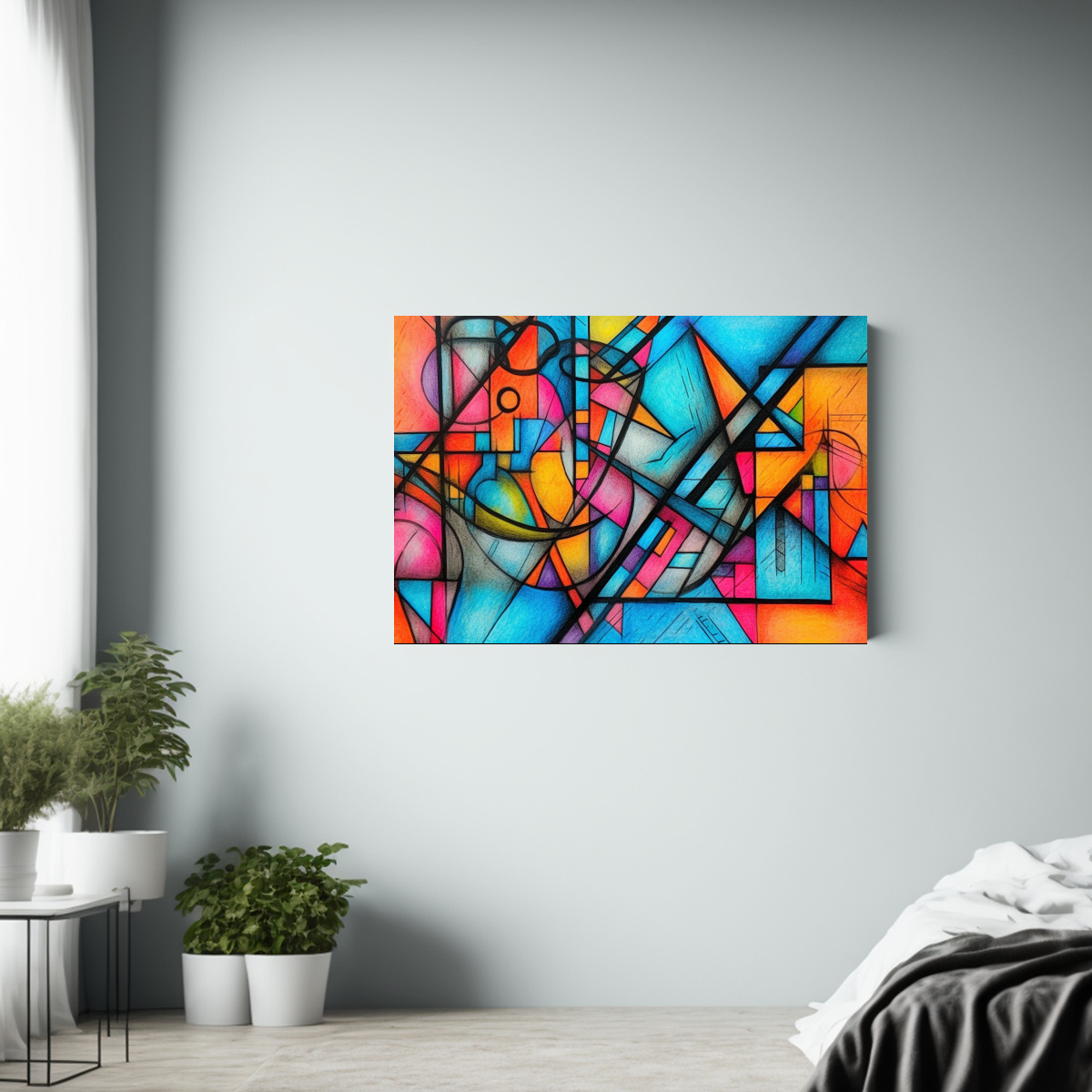 Renueva tu espacio con este vibrante cuadro abstracto cubista en colores neón que destacará en cualquier ambiente La combinación de tonos brillantes como coral, turquesa y carmesí brindará una energía única a tu hogar u oficina Atrévete a colocarlo en la sala de estar para crear un punto focal moderno y sofisticado