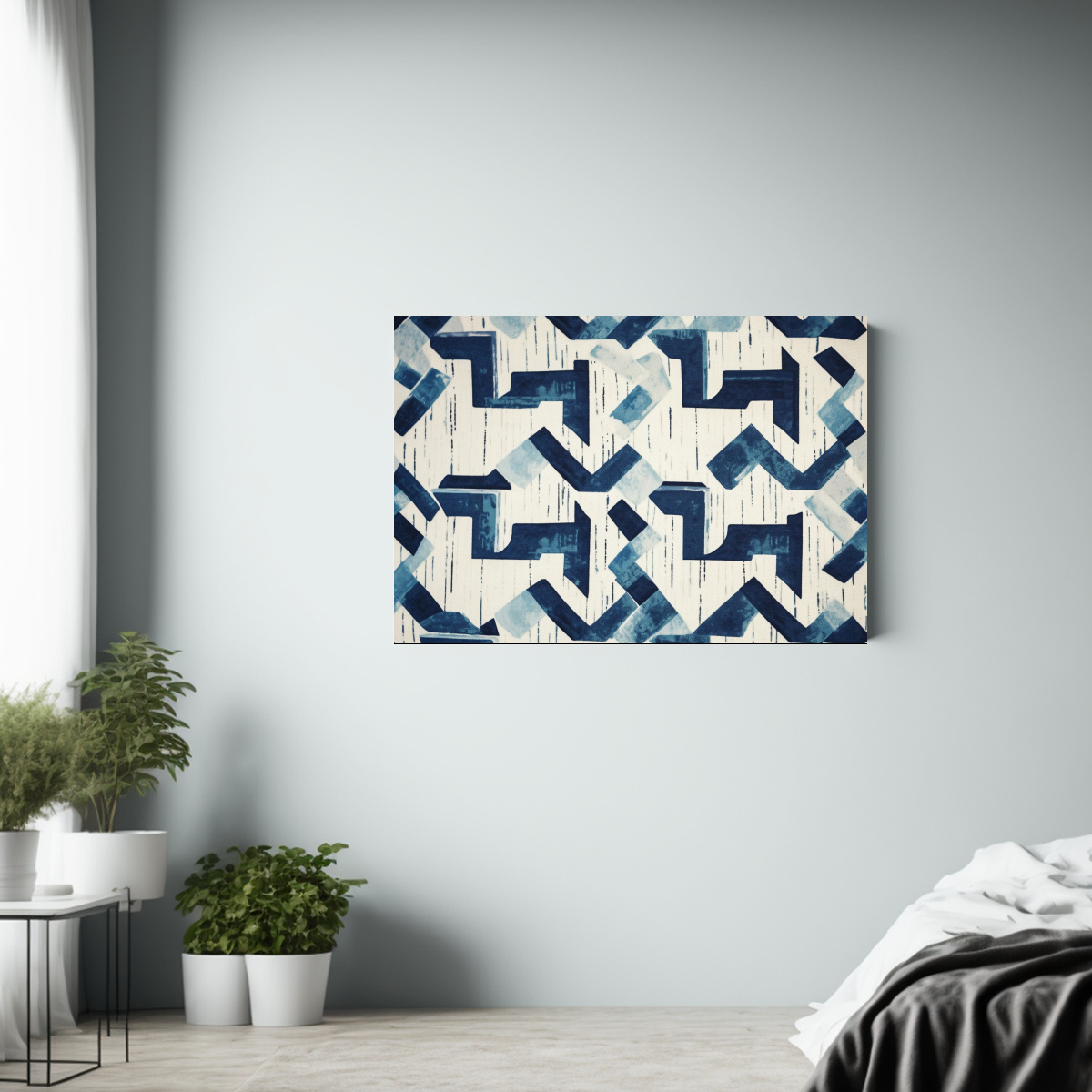 Para realzar la elegancia de tu sala de estar, coloca este Cuadro Geométrico Azul Oscuro sobre un sofá beige claro y combínalo con cojines en tonos plateados y turquesa ¡Lograrás un espacio armonioso y vanguardista!