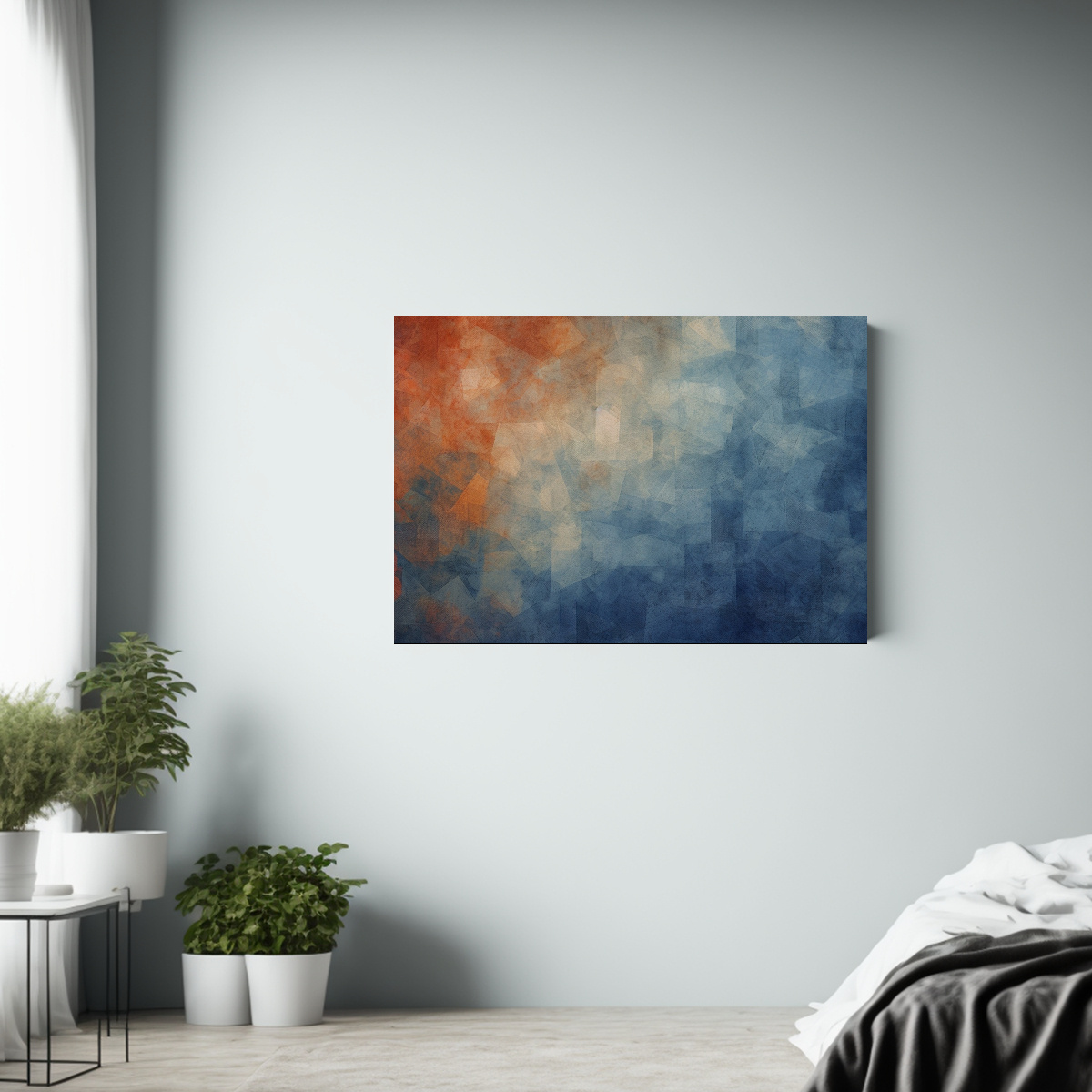 Este cuadro quedará perfecto en una pared blanca para resaltar sus tonos azul, naranja y azul oscuro Combínalo con muebles en tonos neutros para crear un ambiente moderno y sofisticado