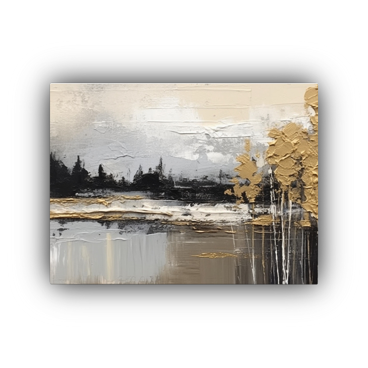 Lienzo de tela con una adorable escena de paisaje en tonos dorado y blanco sobre un elegante marco negro Perfecto para dar un toque sofisticado a tu hogar Decora con estilo y distinción con este cuadro de alta calidad